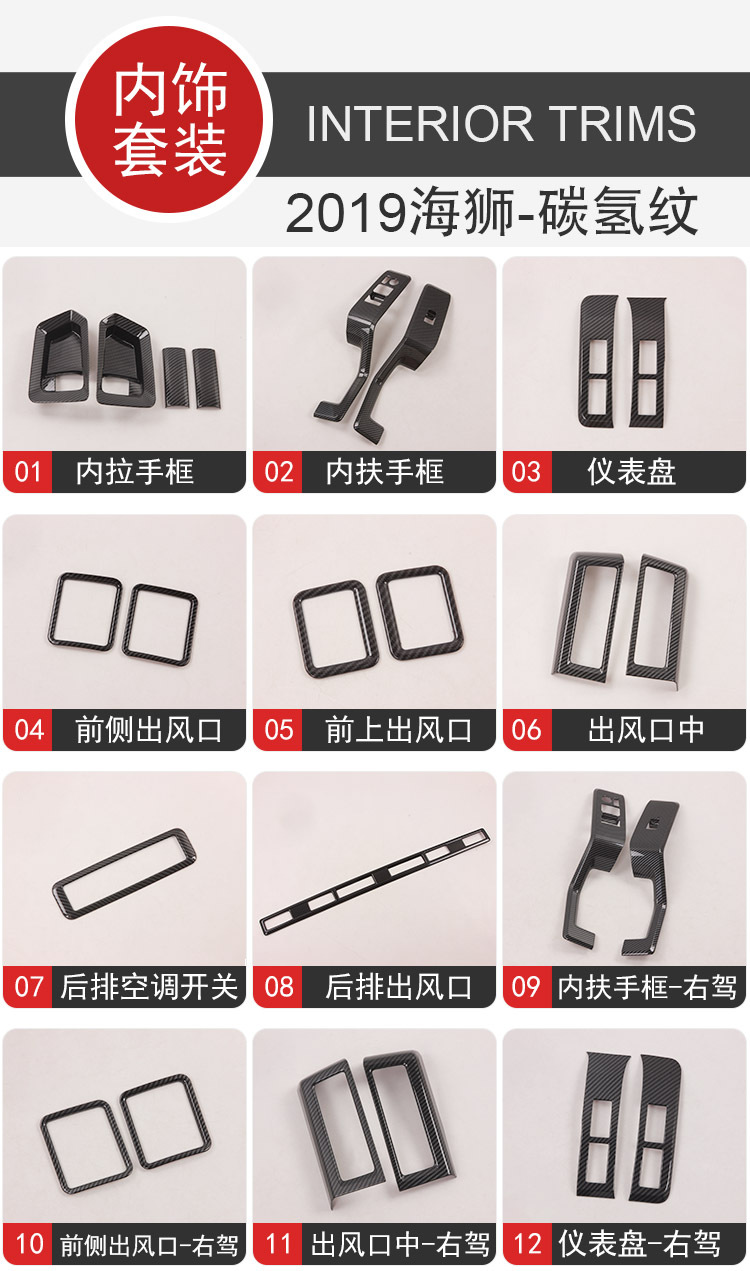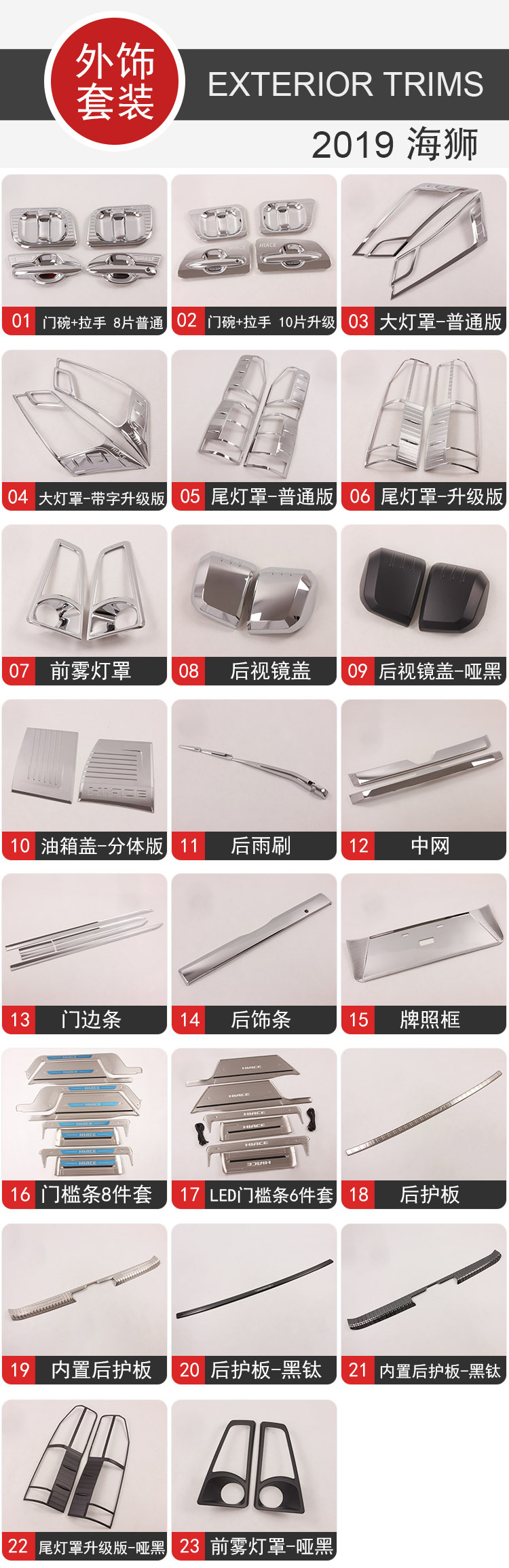 Дверная чаша + ручка 10 штук модернизированного покрытия; Дверная чаша + ручка 8 обыкновенная обшивка; Покрытие для обновления абажура заднего фонаря; Абажур-с покрытием обновления персонажа; Покрытие крышки зеркала заднего вида; Покрытие передней противотуманной фары; Обшивка крышки заднего дворника; Встроенное Гальваника крышки топливного бака; Крышка бака-разделенная плакировка; Дверные чаши + ручки 8 штук из обычного углеводородного рисунка; Крышка масляного бака с разрезной углеводородной текстурой; Абажур обыкновенный вариант углеводородный узор; Абажур заднего фонаря обычный вариант с углеводородным узором; Крышка зеркала заднего вида с углеводородным узором
