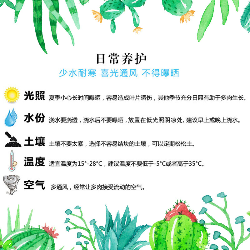 风:多注意通风(通风并不是指吹风,空气流通)因为多肉植物大多生活在高山或者沙漠环境,空气流通特别重要,既可以更快的吹走多余的水分,又能防止生虫生霉,大部分虫子都是因为在室内不通风的环境而出现的,而且通风不好很容易发霉,或者导致多肉植物腐烂,所以我觉得这个应该是重要的。