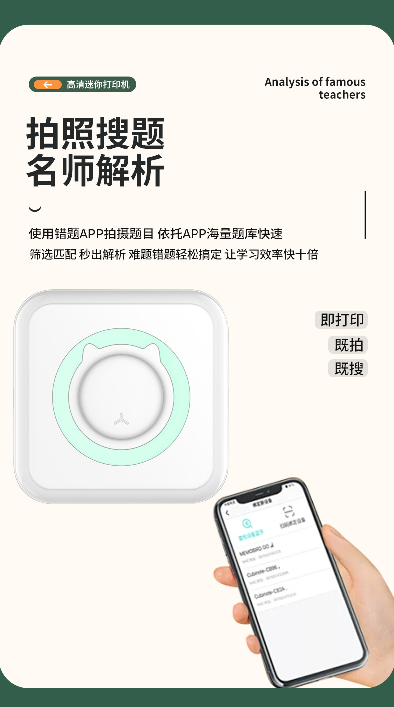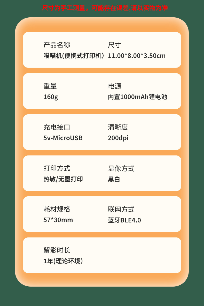 出厂标配:主机+充电线+说明书+打印纸1卷
