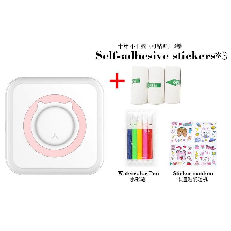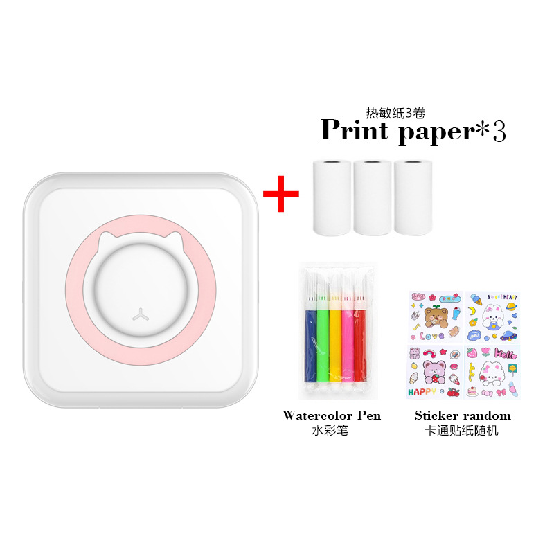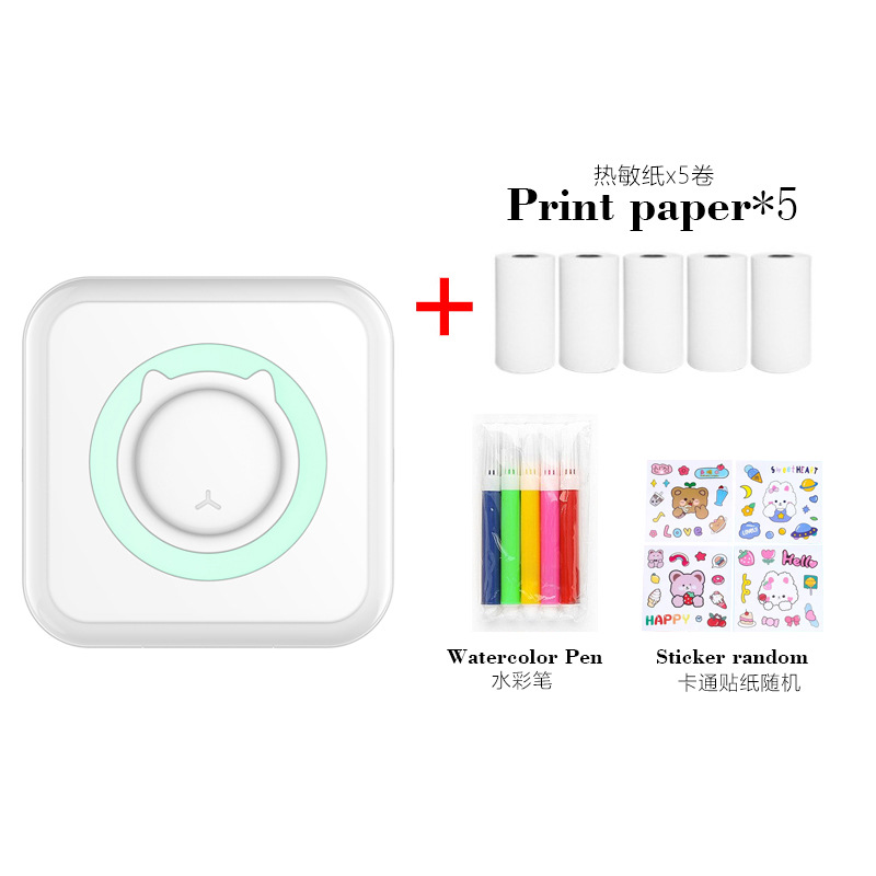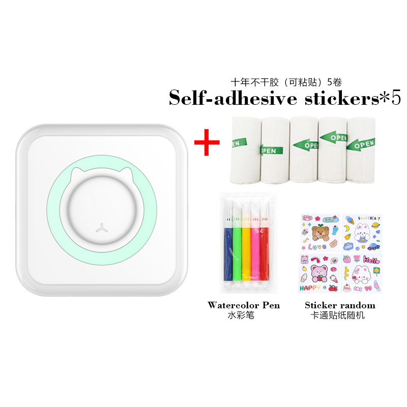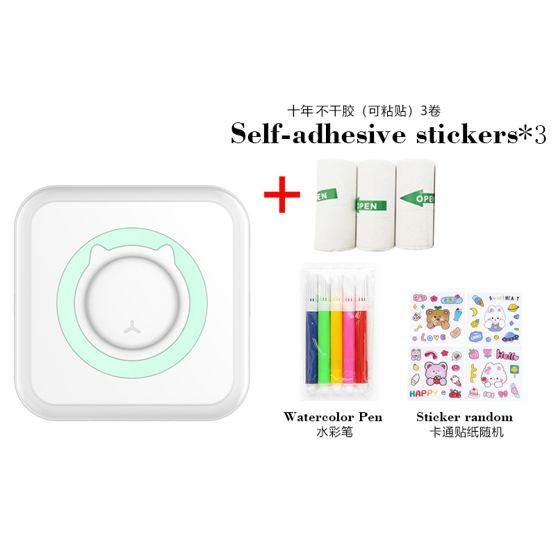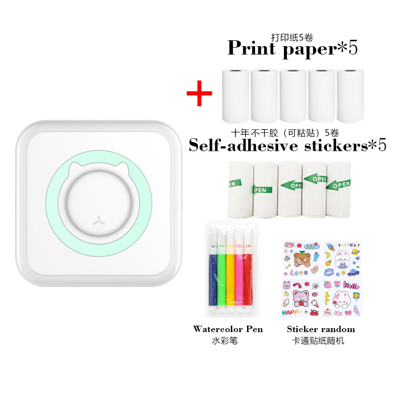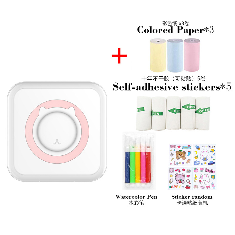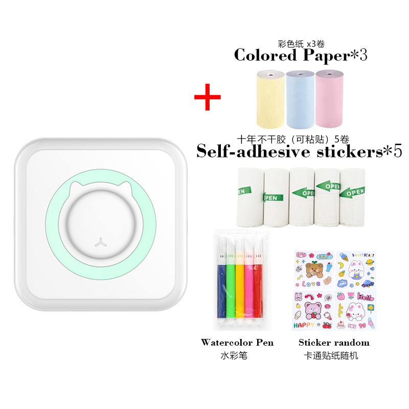 打印机1台+【自带1卷热敏纸+5卷热敏纸+5卷不干胶+3卷彩色纸+6支水彩笔+贴纸】为一整套。