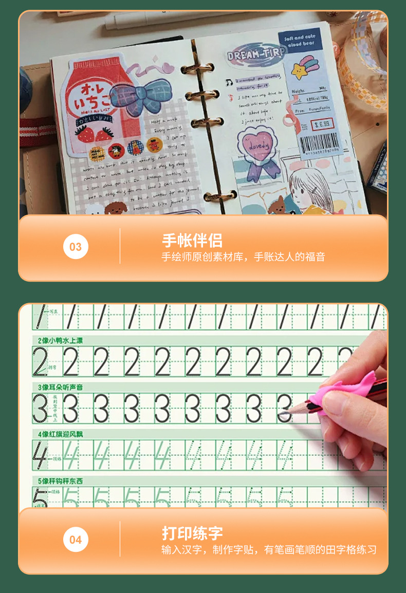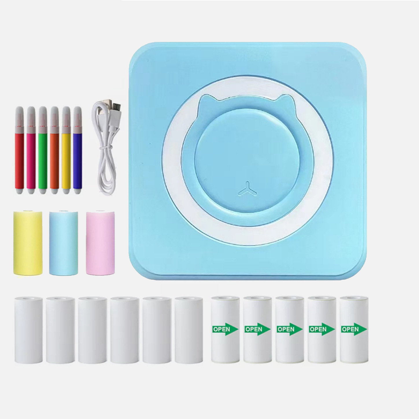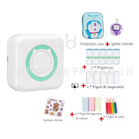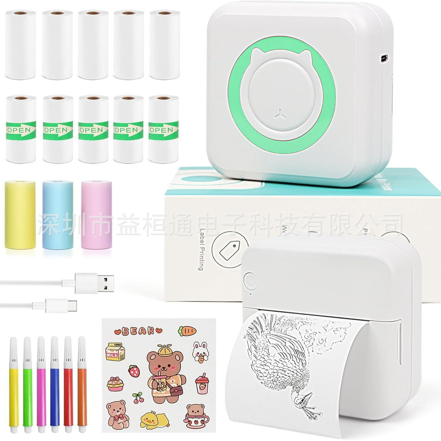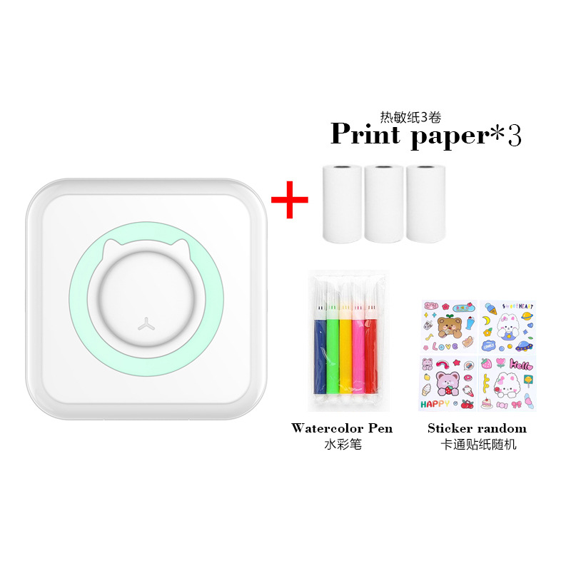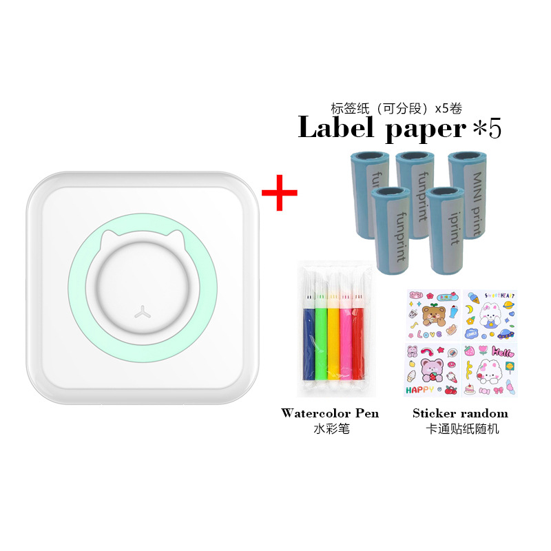 打印机1台+【自带1卷热敏纸+5卷热敏纸+5卷不干胶+3卷彩色纸+6支水彩笔+贴纸】为一整套。