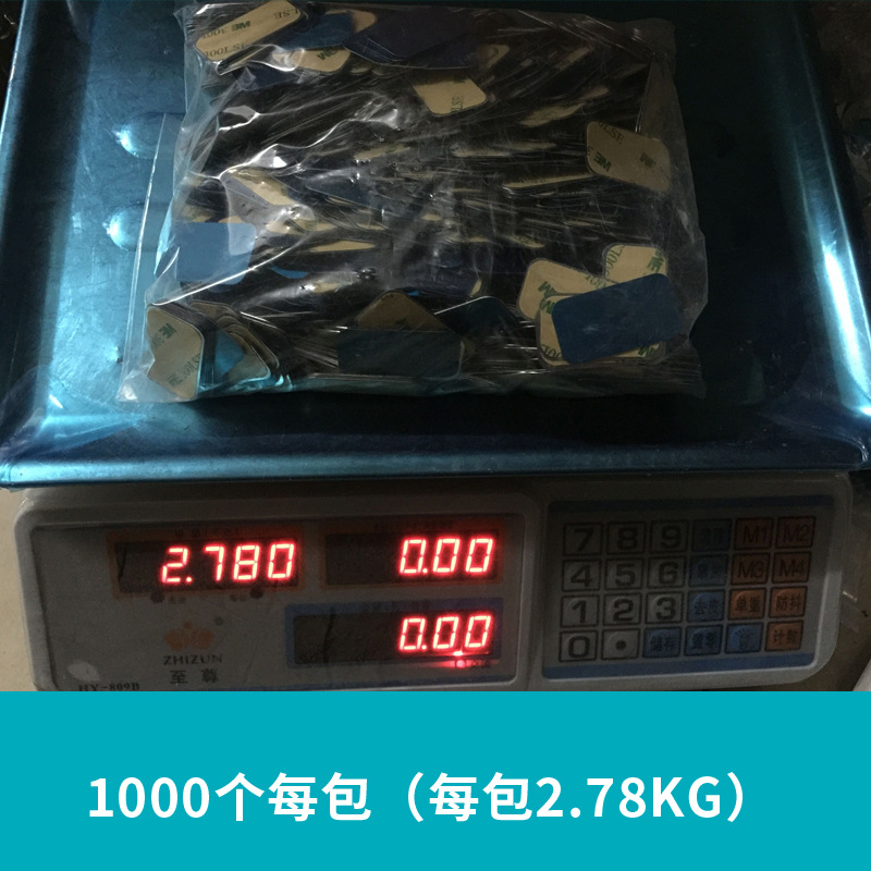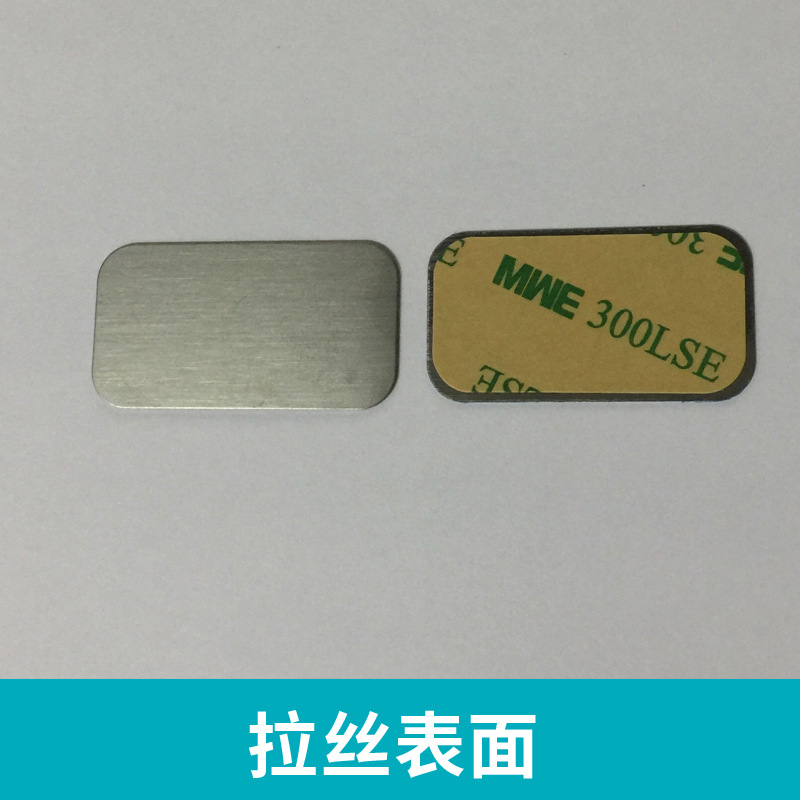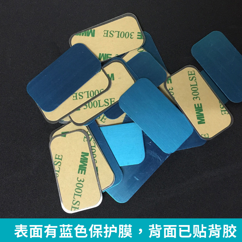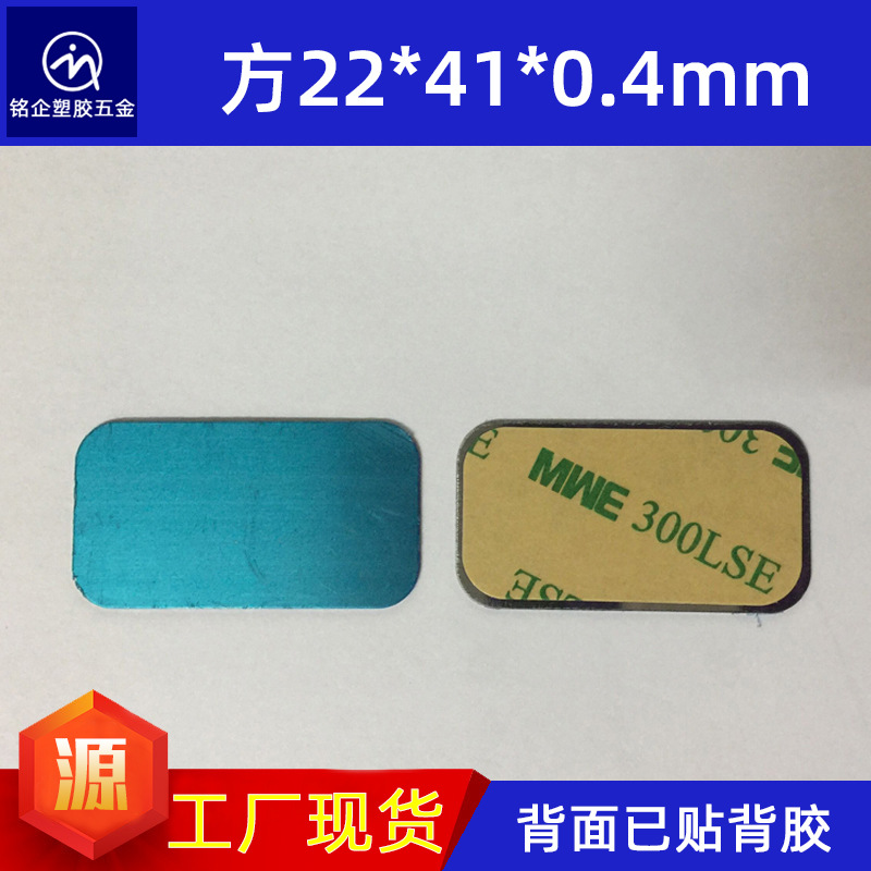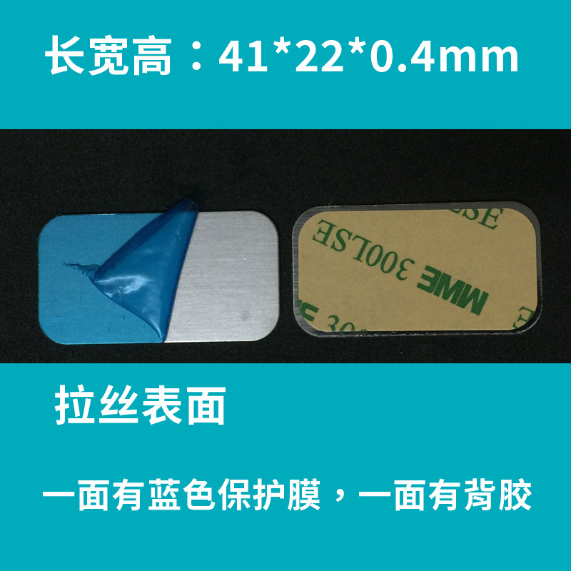 1.引磁片尺寸长宽高:41*22*0.4mm,材质为不锈铁拉丝表面,表面有蓝色保护膜,背面已人工贴好强粘双面胶。
