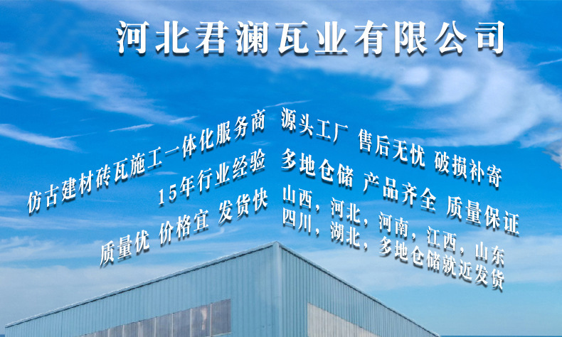 (四) 如您对我们的服务承诺还有什么要求的可以提出,我们将积采讷。用户满意是河北君澜瓦业有限公司始终不渝的追求。 公司除生产各类青瓦,琉璃瓦,青砖,砖雕,水泥花窗产品外,还可根据客户的特殊需求定做各种异型产品,品种齐全,质量,价格合理,公司可为客户提供测量、设计、建筑施工的一条龙服务和单项工程