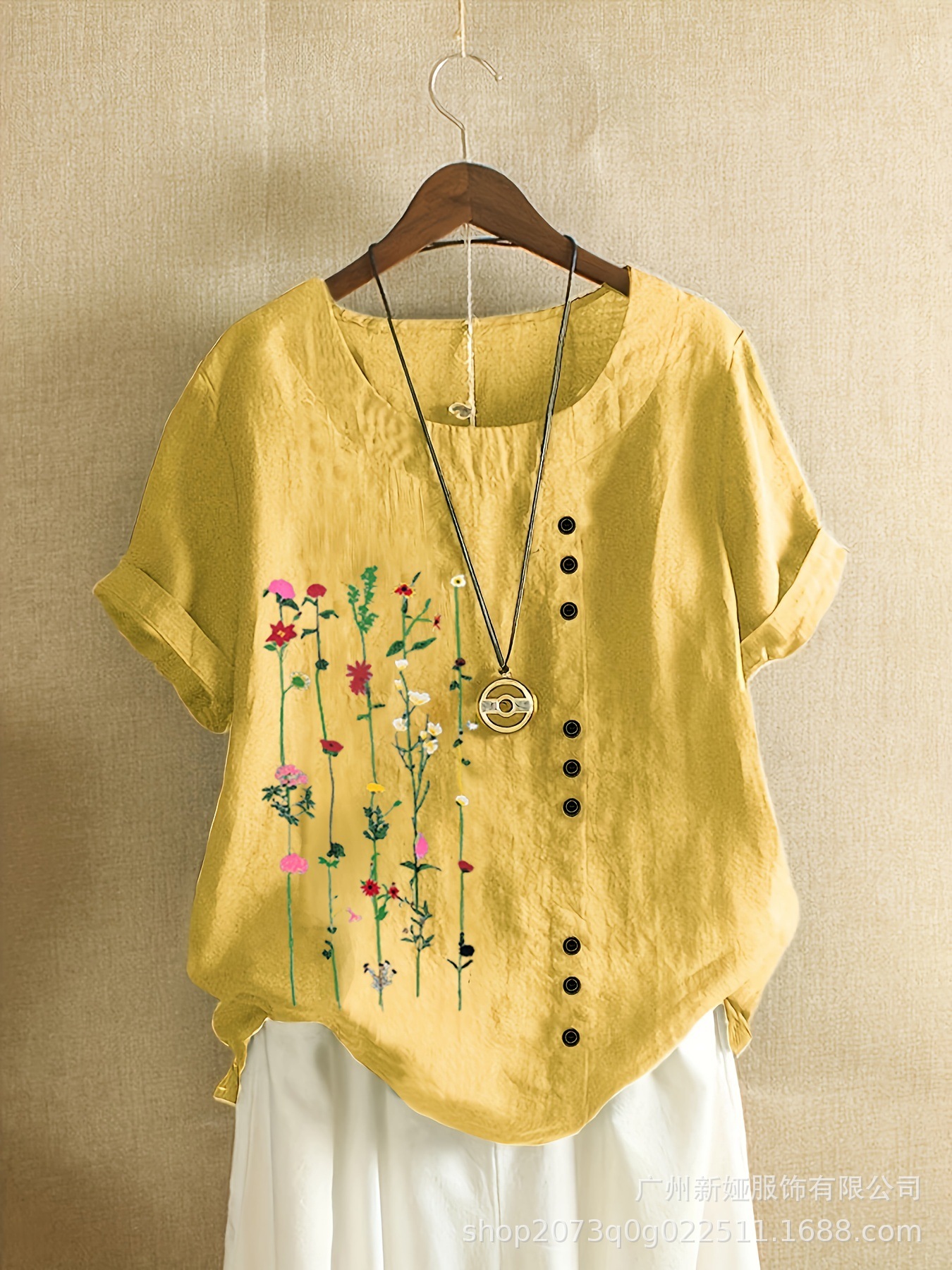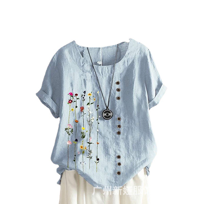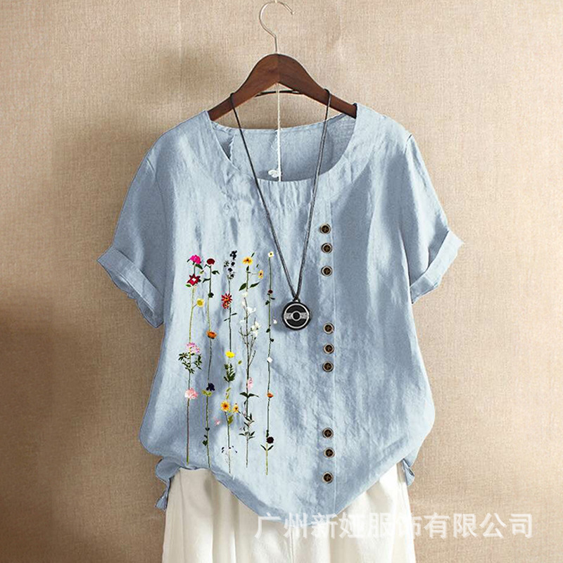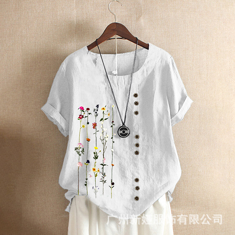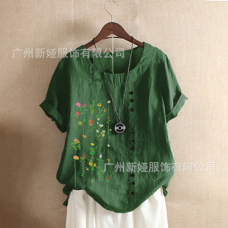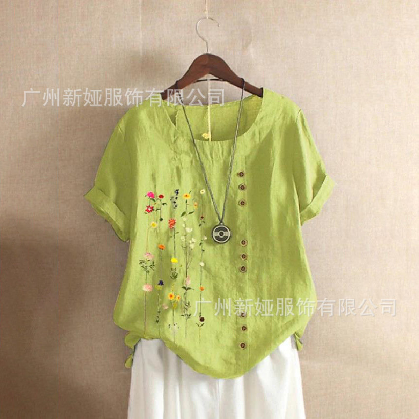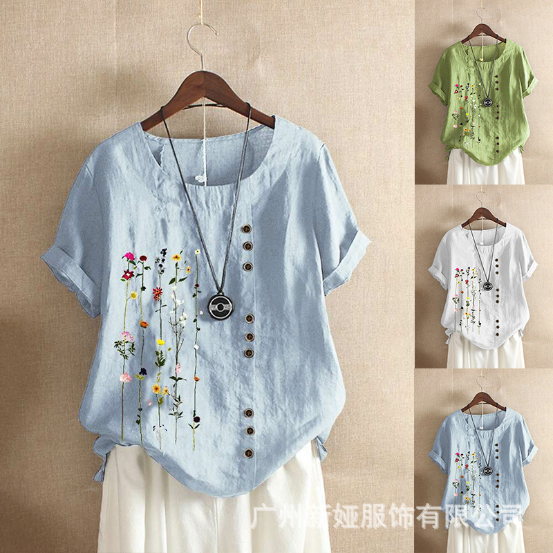 2022 летняя новая Повседневная Свободная футболка больших размеров из хлопка и льна с короткими рукавами и принтом, Женская одежда из хлопка и льна