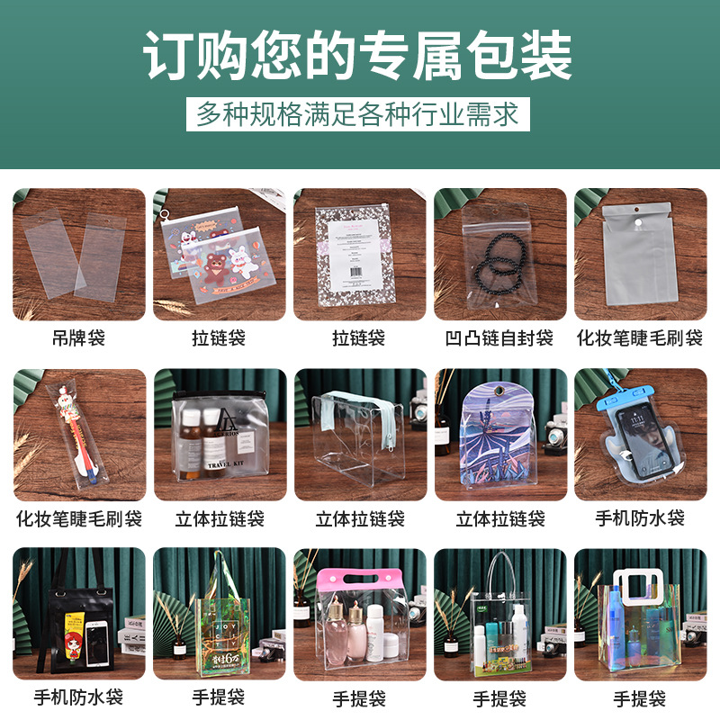 维鸿包装专注制作各类PVC袋:透明吊牌袋、平口袋、拉链袋、化妆品袋、自封袋、证件袋、手机防水袋、化妆品袋、手提袋等各种用PVC材料做成的包装袋子。
