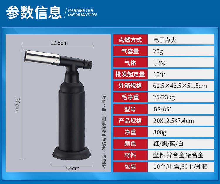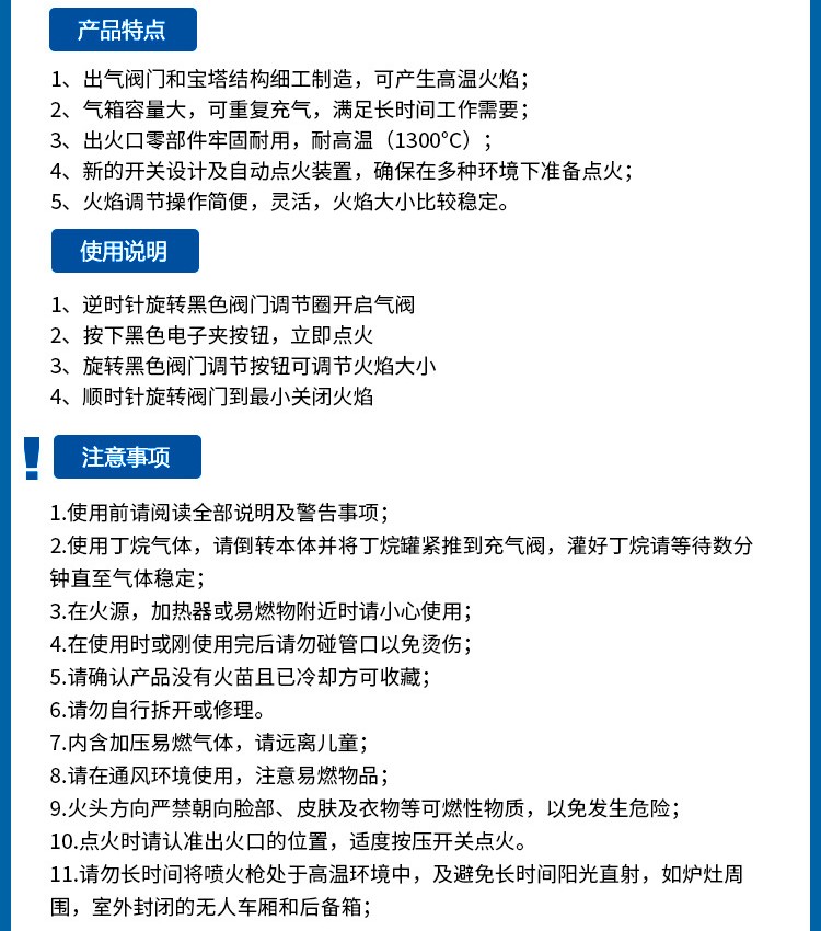 另外,喷火枪打火机的使用是有方法,较多买家没有调好或没有充好气体以为是质量问题,但是实际上动手研究一下就搞定了。有关方法可随时咨询客服。