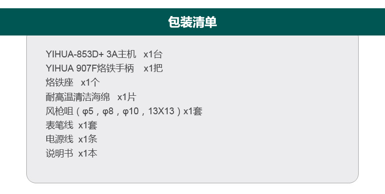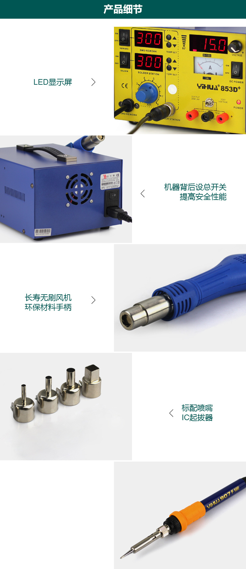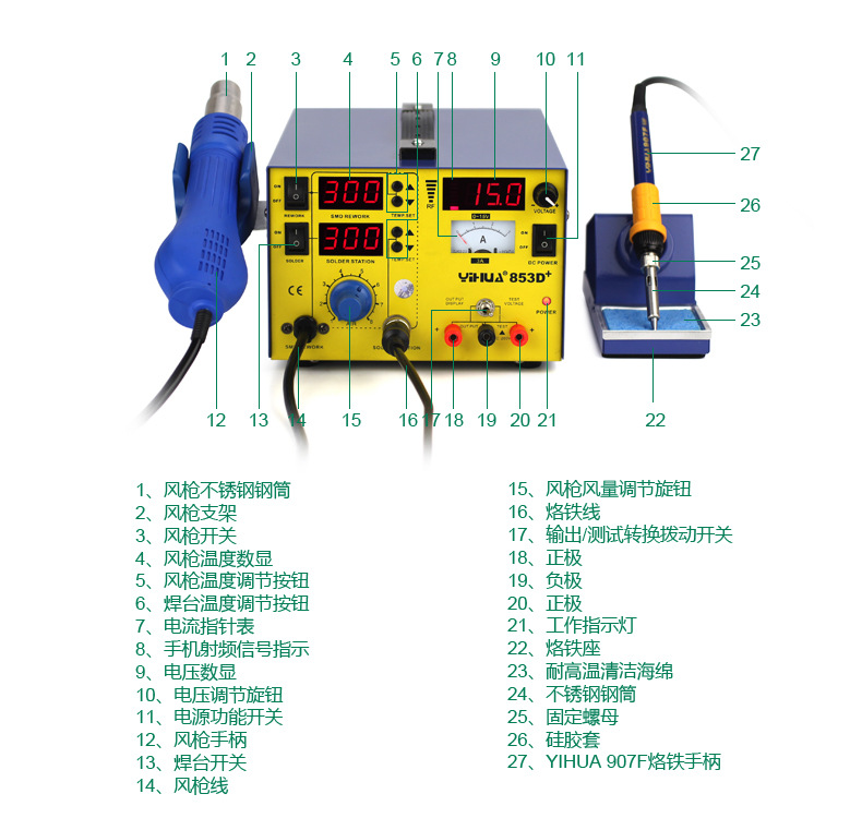 Yihua YIHUA-853D + Мощный демонтажный комплекс горячим воздухом «Три в одном» с источником питания 15 В, 3 А