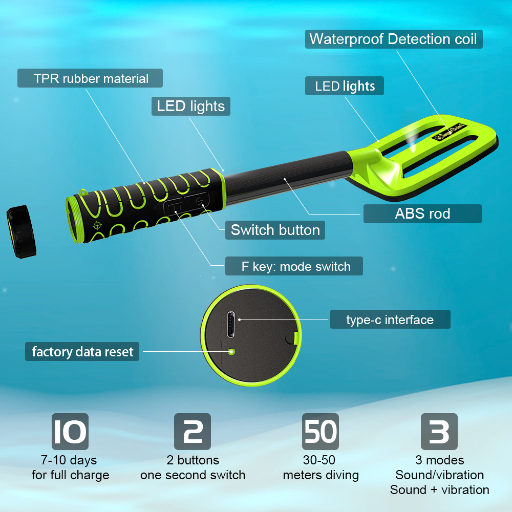 ·恭喜您选择了潜水金属探测器。这是一款手持式金属探测器,设计用于在寻宝过程中精确定位金属(黑色和有色金属)物体。它是在与地面搜索金属探测器结合使用,以帮助发现金属目标。