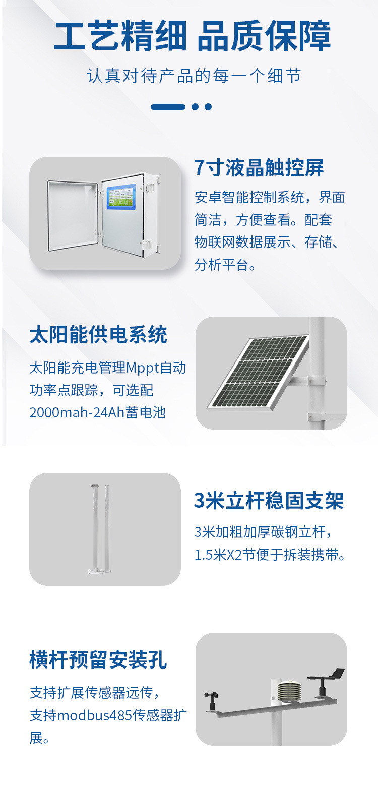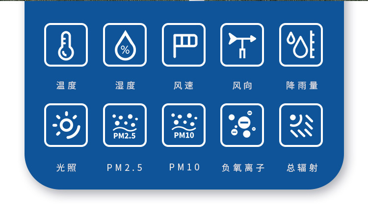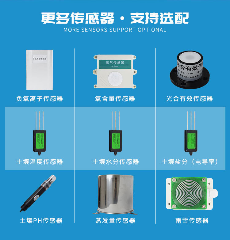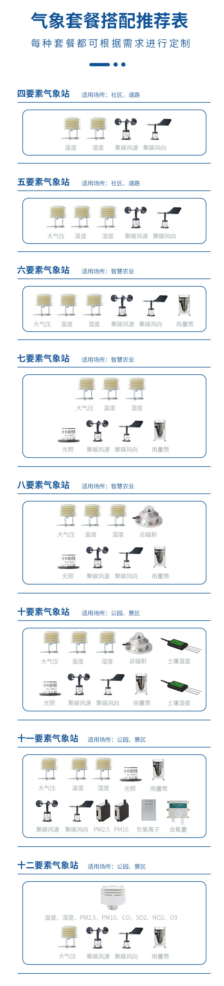 Двухэлементная Метеостанция (скорость ветра, направление ветра); Четыре метеостанции (скорость ветра, направление ветра, температура, влажность); Пятиэлементная Метеостанция (скорость ветра, направление ветра, температура, влажность, атмосферное давление); Метеостанция из шести элементов (скорость ветра, направление ветра, температура, влажность, атмосферное давление, осадки); Семь метеостанций (скорость ветра, направление ветра, температура, влажность, атмосферное давление, количество осадков, световое/общее излучение); Метеостанция из восьми элементов (скорость ветра, направление ветра, температура, влажность, атмосферное давление, количество осадков, свет, общая радиация); Метеостанция из 10 элементов (скорость ветра, направление ветра, температура, влажность, атмосферное давление, осадки, свет, общая радиация, PM2.5/PM10, шум); Метеостанция 11 элементов (скорость ветра, направление ветра, температура, влажность, атмосферное давление, дождь, свет, общее излучение, PM2.5, PM10, шум); 12 элементов метеостанции (скорость ветра, направление ветра, температура, влажность, атмосферное давление, осадки, PM2.5, PM10, CO, SO2, NO2; Метеорологический датчик из шести элементов; Датчик температуры и влажности жалюзи; Датчик атмосферного давления Жалюзи; Датчик светового корпуса жалюзи; Датчик коробки жалюзи PM2.5, PM10; Датчик коробки шума жалюзи; Датчик коробки углекислого газа жалюзи; Датчик скорости и направления ветра