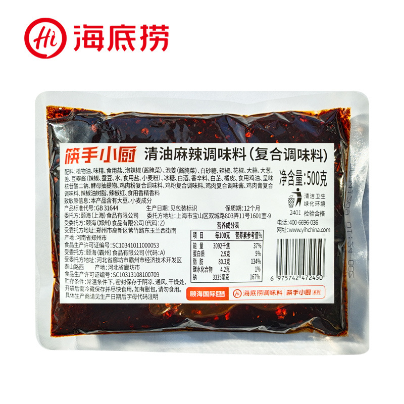 Прозрачное маслянистое острое: растительное масло, перец чили, глутамат натрия, соль пищевая, бобовая паста, специи, белый сахар, маринованный перец, монокристаллический каменный сахар, маринованный имбирь, чеснок, зеленый лук, имбирь, перец Сычуани.