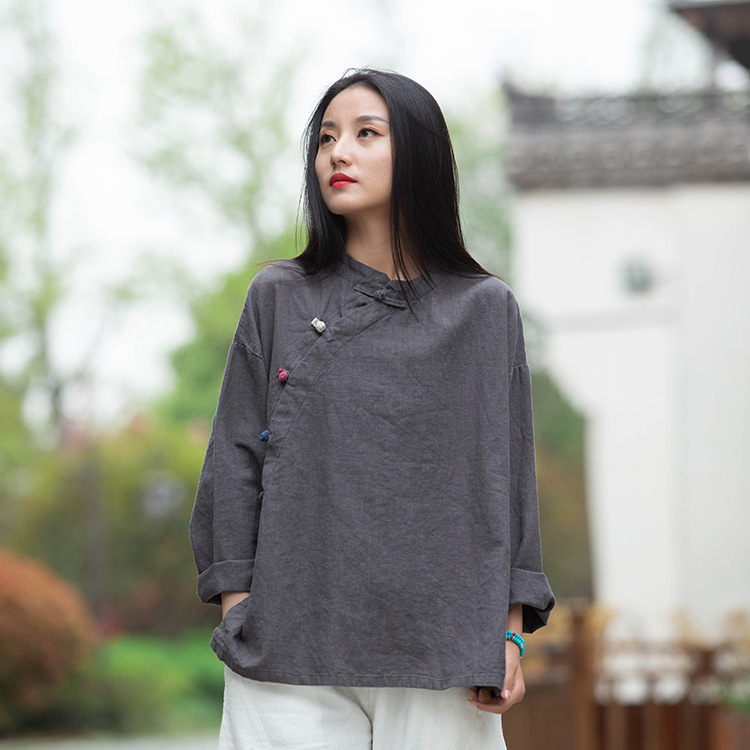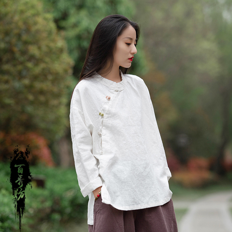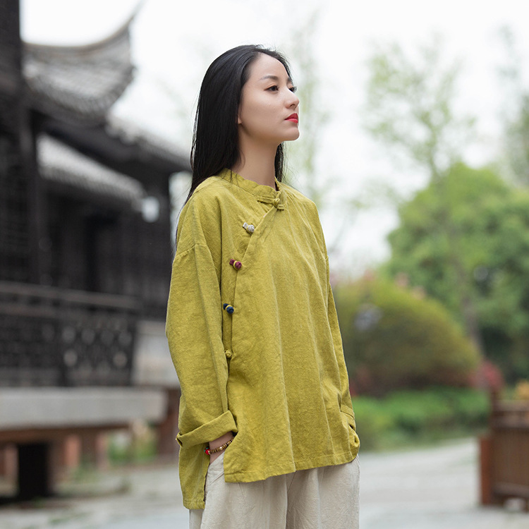 Новая женская рубашка из хлопка и льна на осень/зиму 2025 года, в стиле ретро, с воротником-стойкой, асимметричным цветовым блокированием, эффектом сэндвошинга, на пуговицах, с длинным рукавом