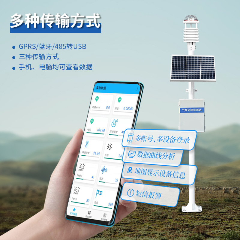 Полностью автоматический и точный мониторинг, относительная влажность, скорость ветра, направление ветра, элегантное давление, осадки, фотоэлектрическое излучение, ультразвуковой мониторинг PM2,5, PM10 в реальном времени.