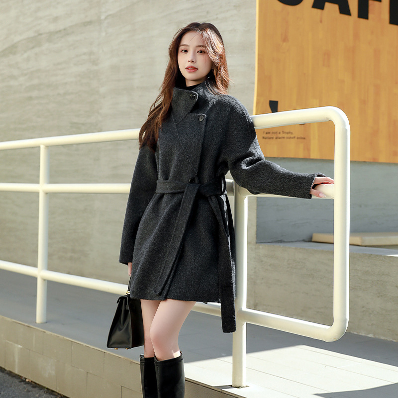 Женское двустороннее кашемировое пальто в японском и корейском стиле с воротником-стойкой, новинка осенне-зимней коллекции 2025 года, элегантная свободная шерстяная куртка для миниатюрных женщин.