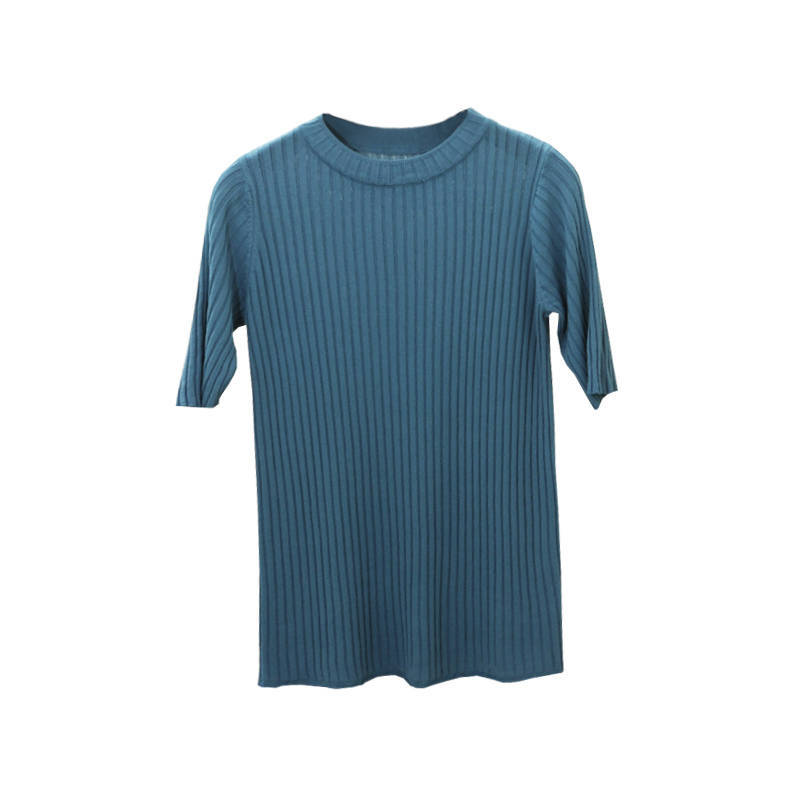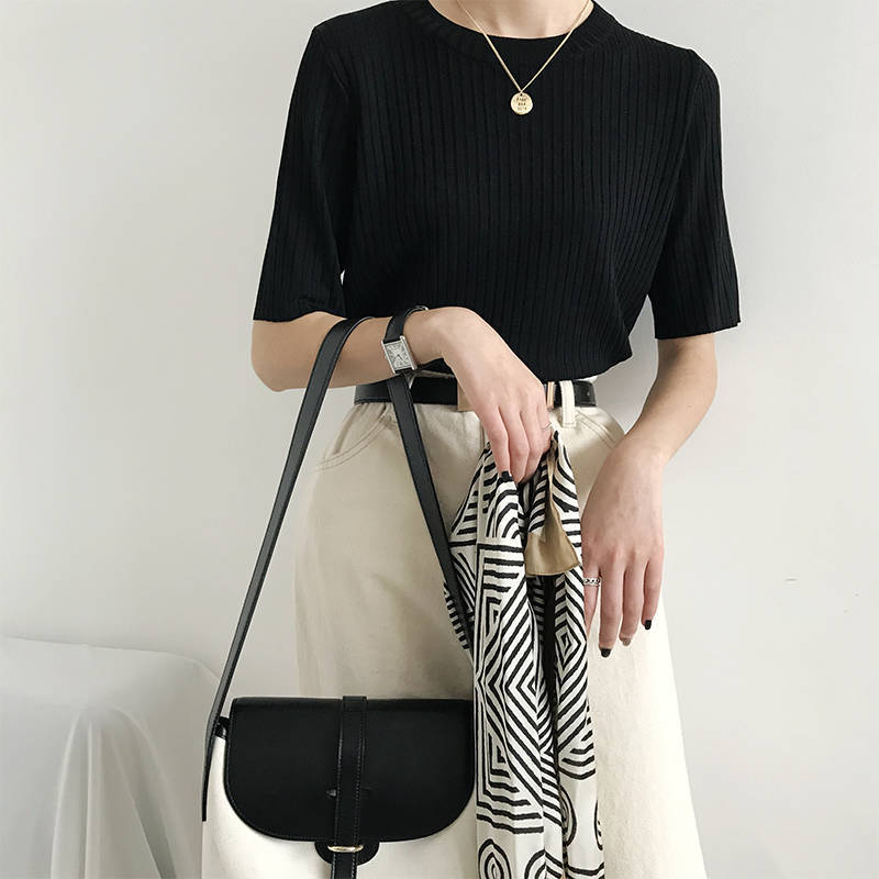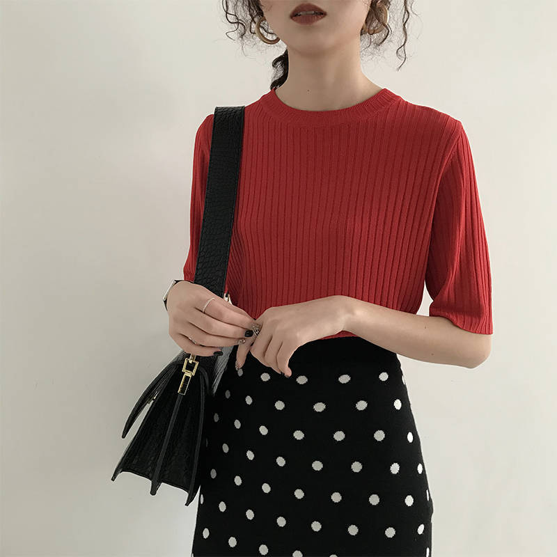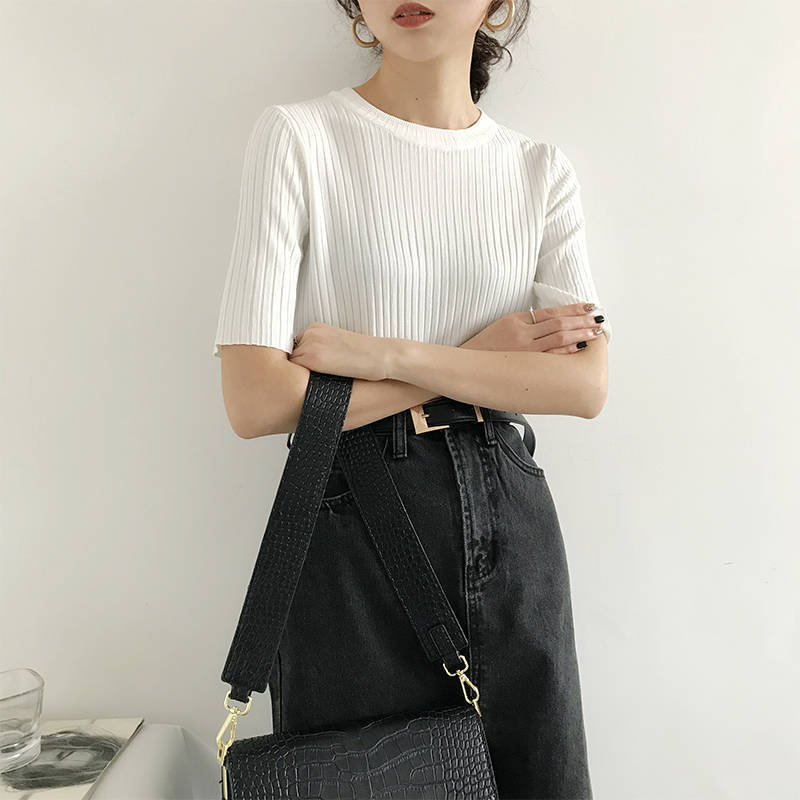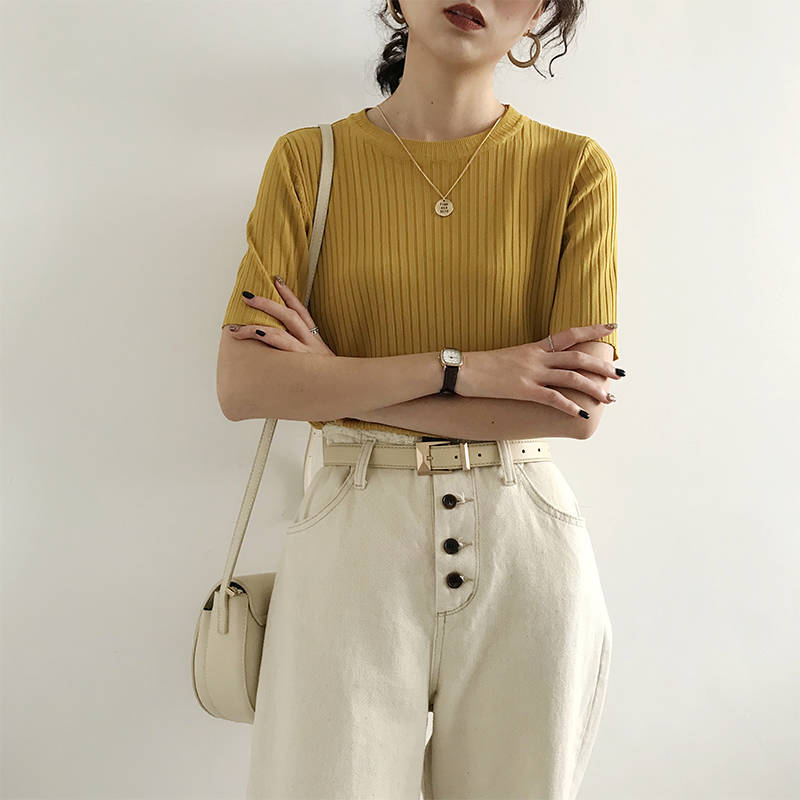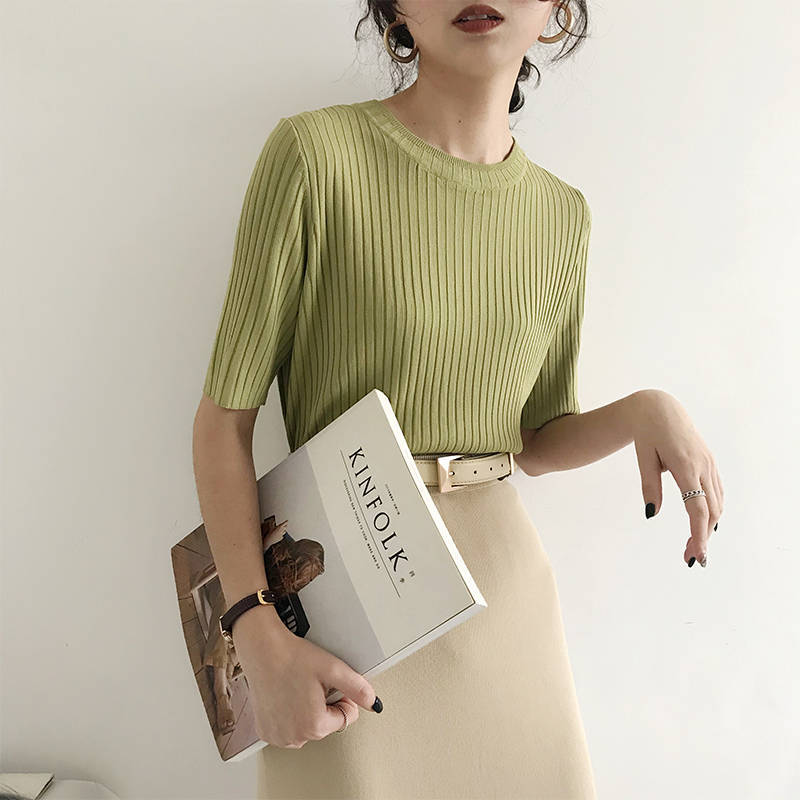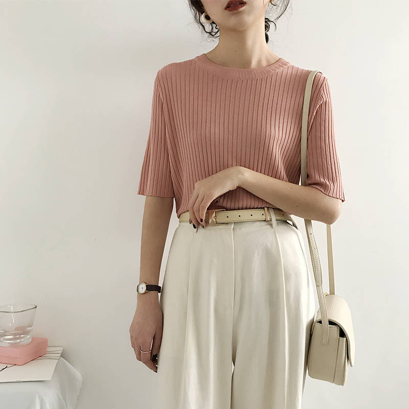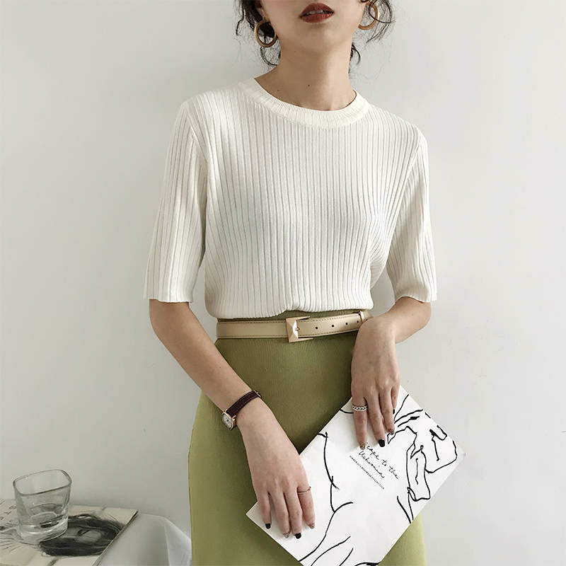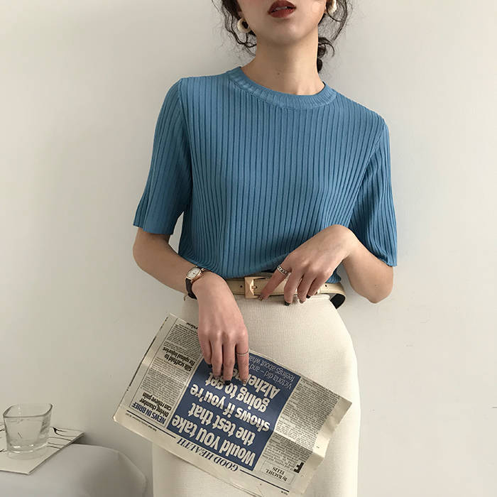 2019 корейская летняя одежда, новый однотонный трикотаж в полоску с круглым вырезом и короткими рукавами, женский универсальный прямой пуловер, модный топ