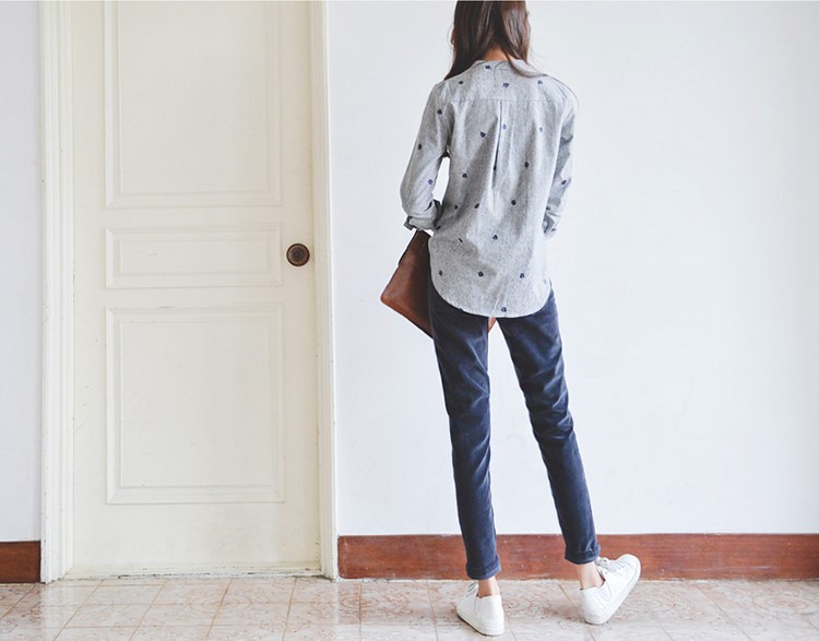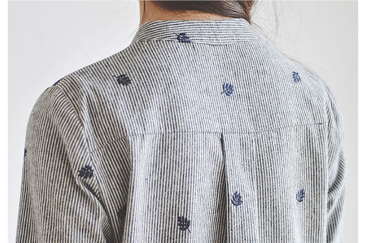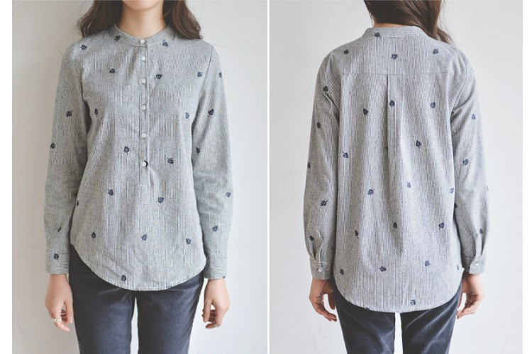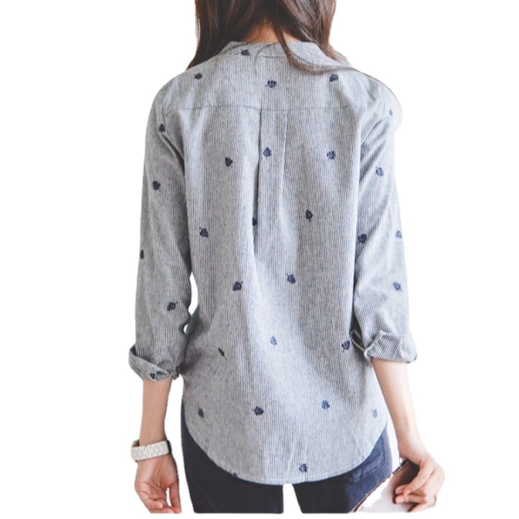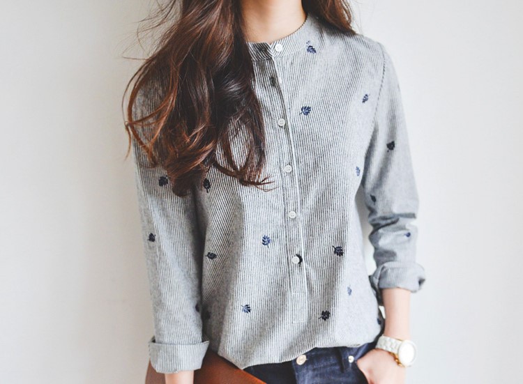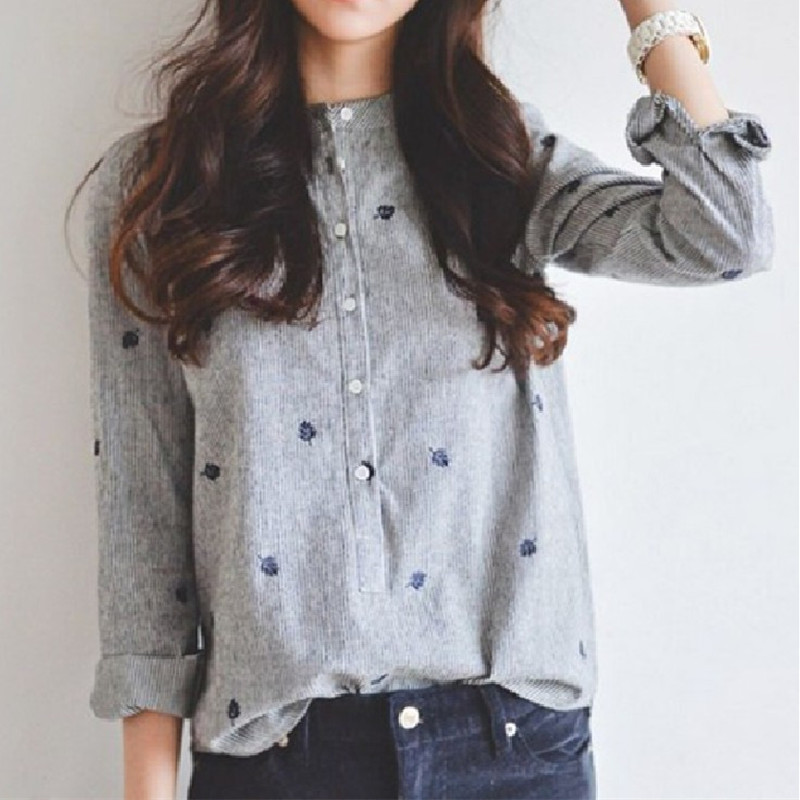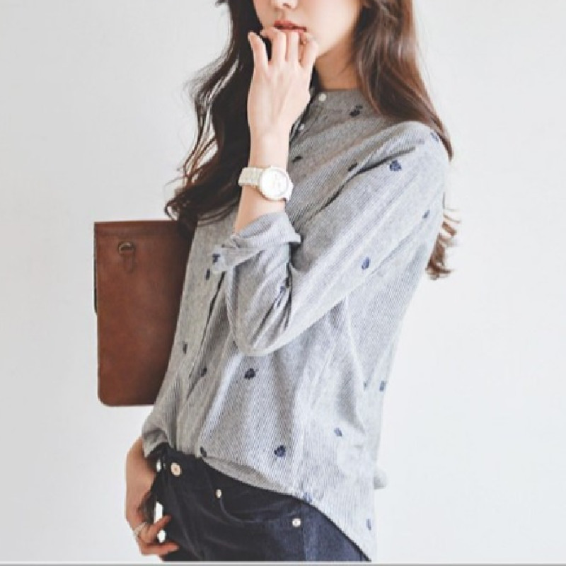 Корейский стиль Новый стиль Школьный стиль Полосатая рубашка с воротником-стойкой Вышитая Базовая рубашка с длинным рукавом Модная
