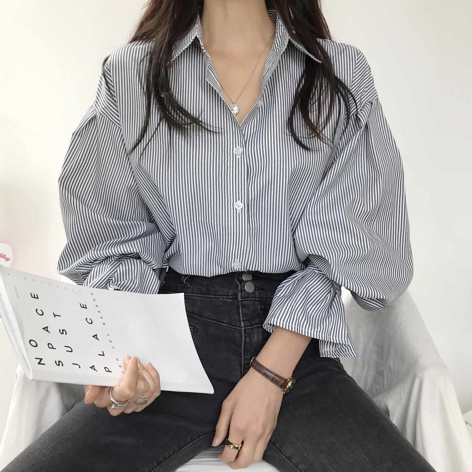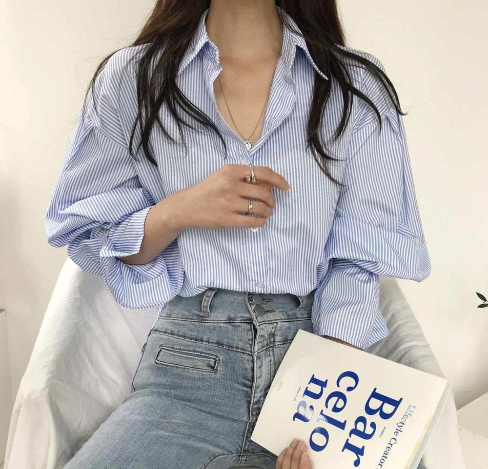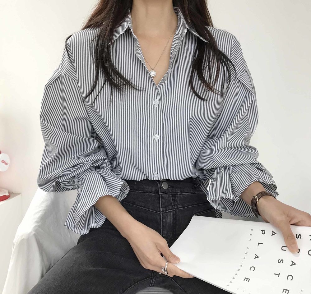 Дизайнерская свободная рубашка в тонкую полоску для женщин, простой внутренний топ с длинными рукавами