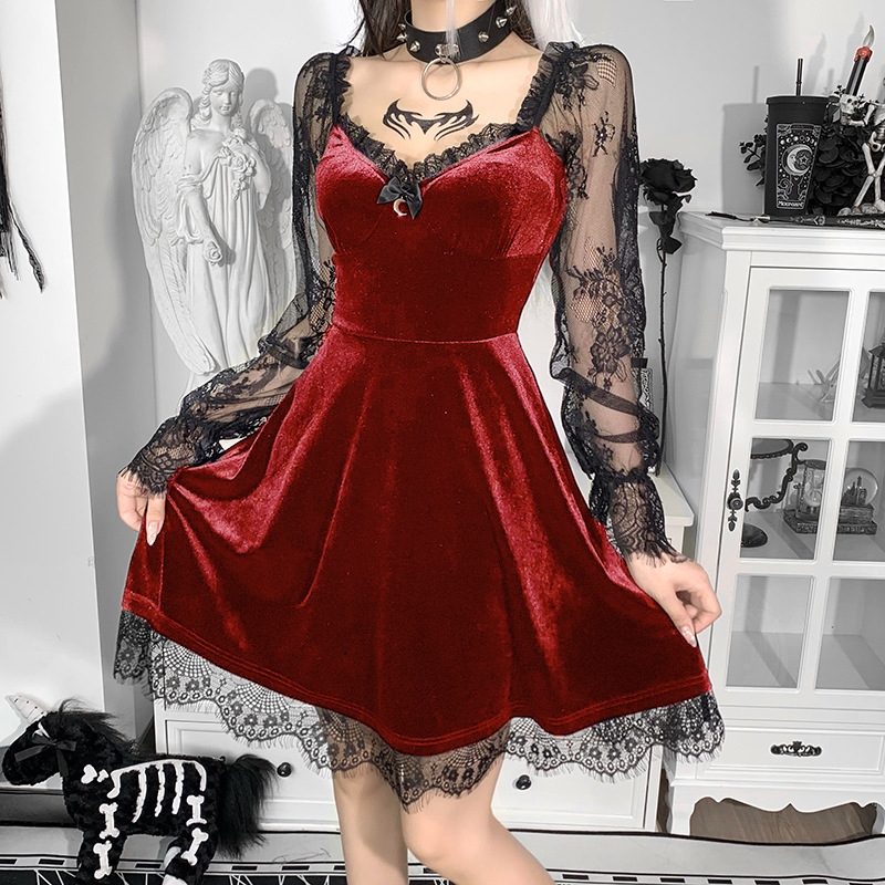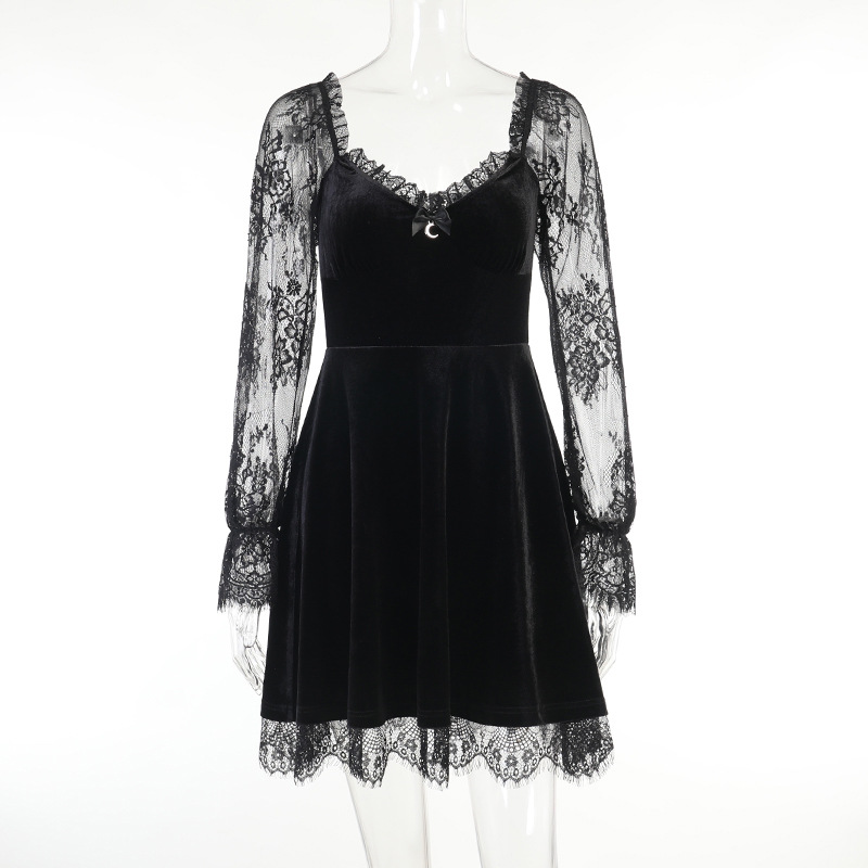 Платье HY21249 в темном европейско-американском стиле, осеннее, новое, универсальное, в стиле хип-хоп, с кружевом, модное, с эффектом увеличения груди, расклешенное, с длинными рукавами.