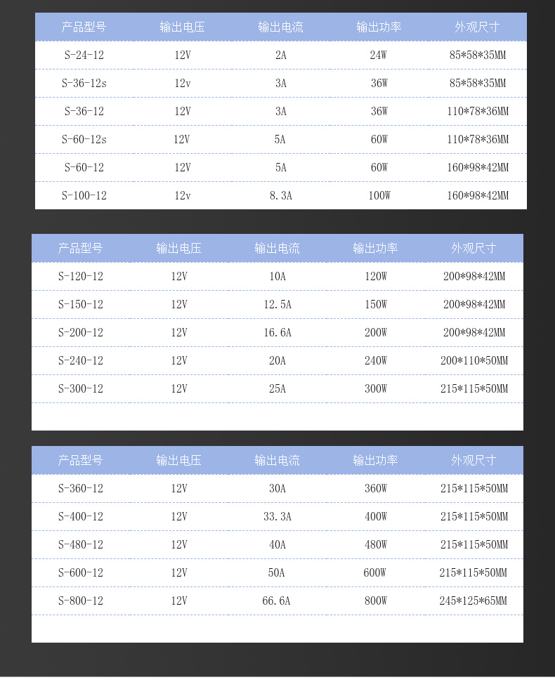 12V2A 24W; 12V3A36W небольшой размер; 12В3А 36Вт большой объем; Маленький размер 12В5А 60Вт; Большой объем 12В5А 60Вт; 12V8.3A 100W; 12V10A 120W; 12V12.5A 150W; 12V16.6A 200W; 12V20A 240W; 12V25A 300W; 12V30A 360W; 12V33.3A 400W; 12V40A 480W; 12V50A 600W; 12V16.6A 800W