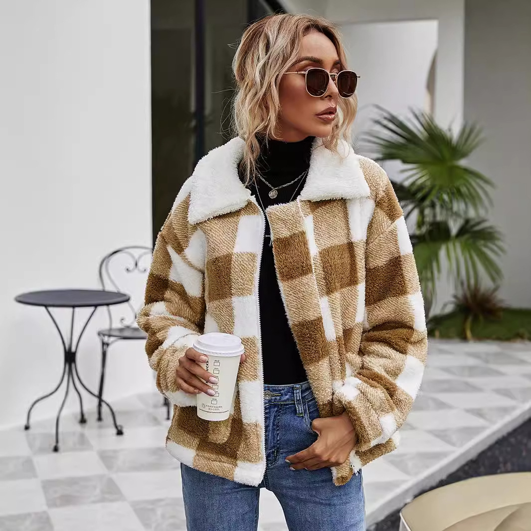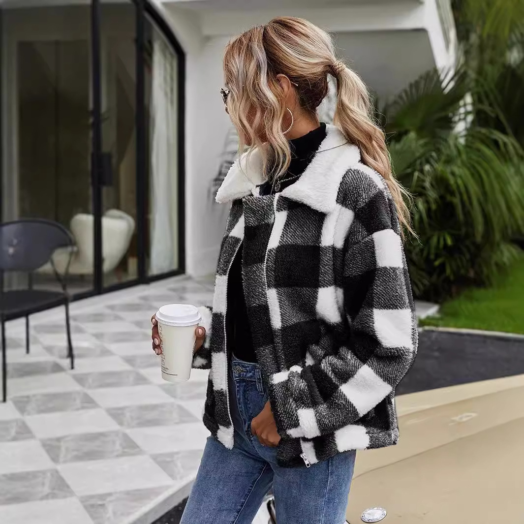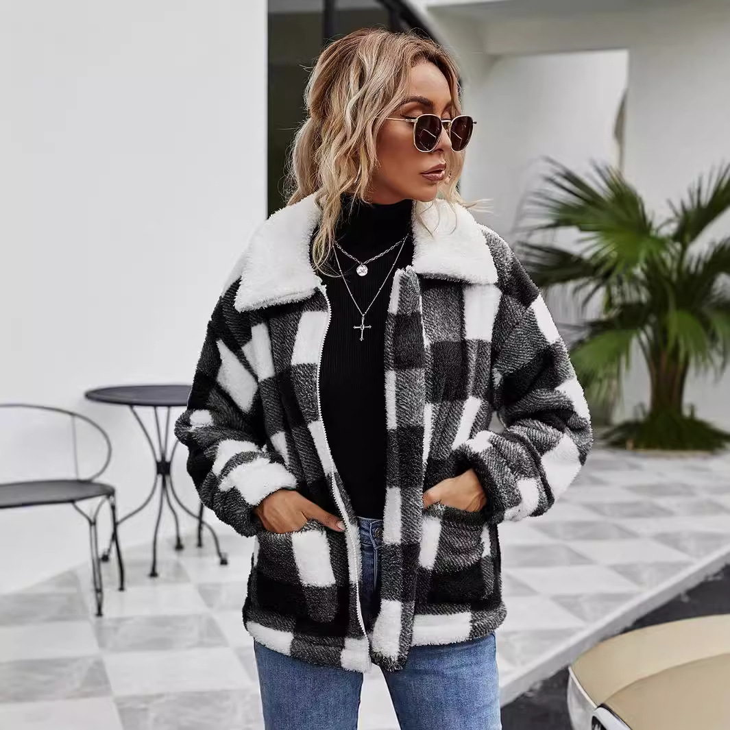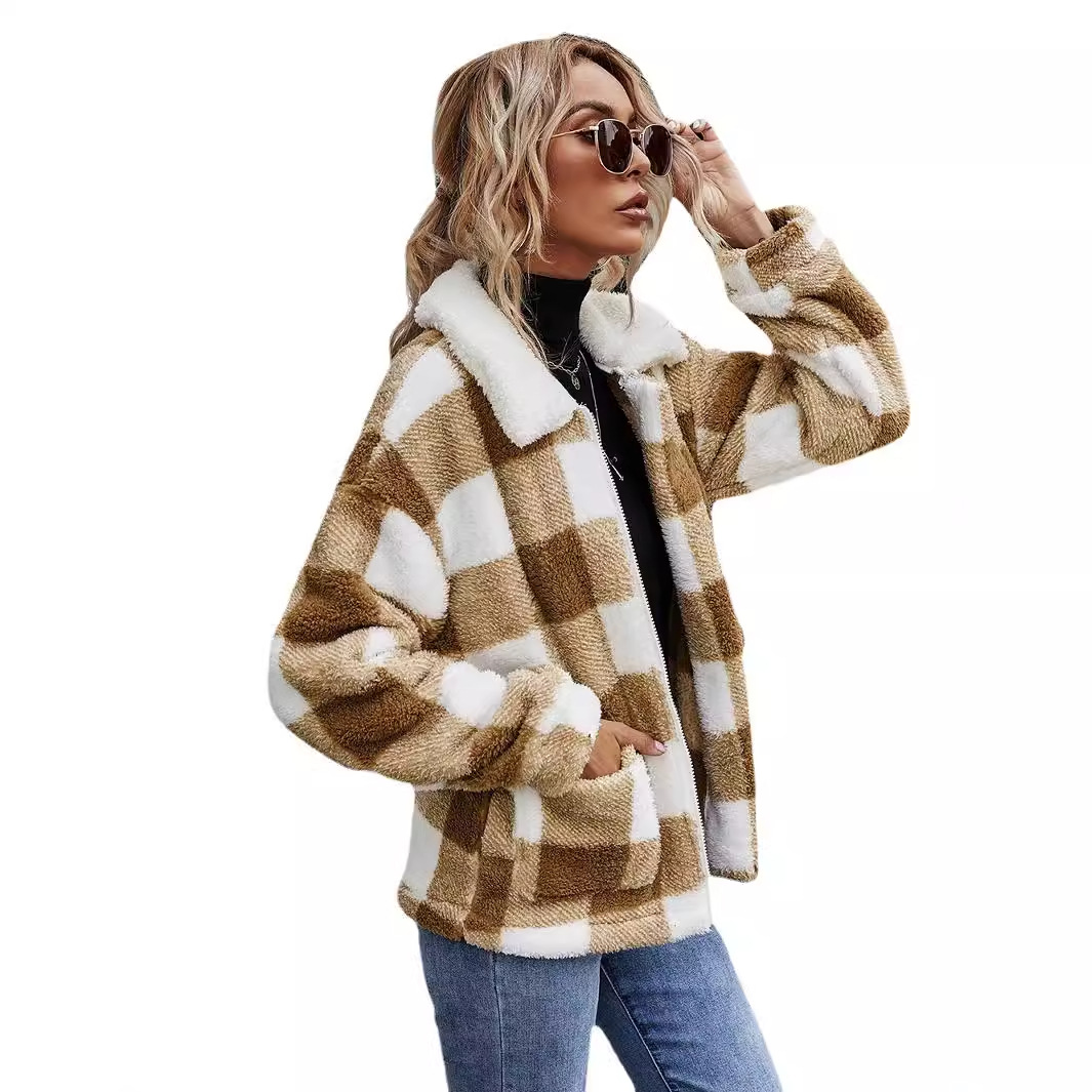 Трансграничные взрывы Amazon Европейский и американский осенне-зимний кардиган на молнии с лацканами Плюшевая клетчатая куртка Свободные элегантные Пригородные женщины