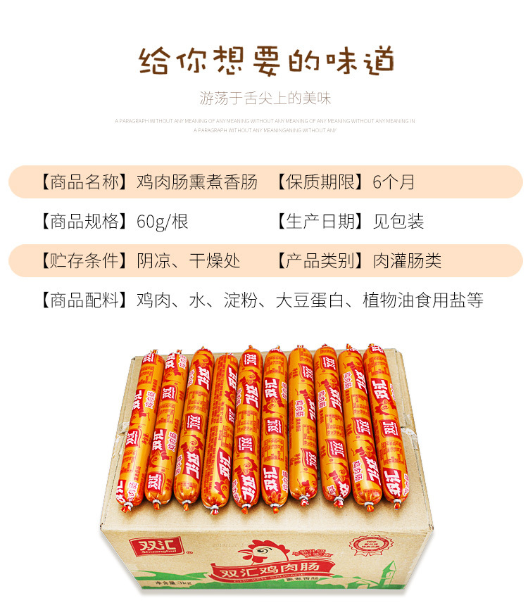 Шуанхуй [Куриная] колбаса с ветчиной 105 г (одинарная); Шуанхуй [65 г] Куриная колбаса (одинарная) [взять 50 штук за всю коробку]; Куриная колбаса Shuanghui, 58 г (шт.) [пожалуйста, возьмите 50 штук за всю коробку]; Shuanghui [35 г] Instant Noodle Partner (одиночный) [заказывайте 60 штук на всю коробку]; Shuanghui [40 г] Instant Noodle Partner (одиночный) [заказывайте 60 штук на всю коробку]; Шуанхуи [Runkou Sweet King, вкус кукурузы] 38 г (шт.) [пожалуйста, возьмите 60 штук для полной коробки]; Shuanghui Run Sweet King [90 г] (одиночный) [возьмите 40 штук за всю коробку]; Шуанхуй [Runkou Sweet King Corn Flavor] Колбаса 95 г (одиночная) [заказывайте 40 штук на всю коробку]; Шуанхуй [Фумей] ветчина 60 г (одиночная) [взять 50 штук за всю коробку]; Шуанхуэй [жареная и на гриле] свинина с крахмалом на пару 42 г (одиночная) [заказывайте 100 штук на всю коробку]; Колбаса Shuanghui [с ароматом виноградного перца] 70 г (одиночная) (заказывайте 50 штук на всю коробку); Shuanghui [Qingka Neng Beautiful Chicken Breast Sausage] 65 г (один) (пожалуйста, возьмите 30 штук за всю коробку); Шуанхуэй Король Королей [35 г] колбаса с ветчиной (одинарная)