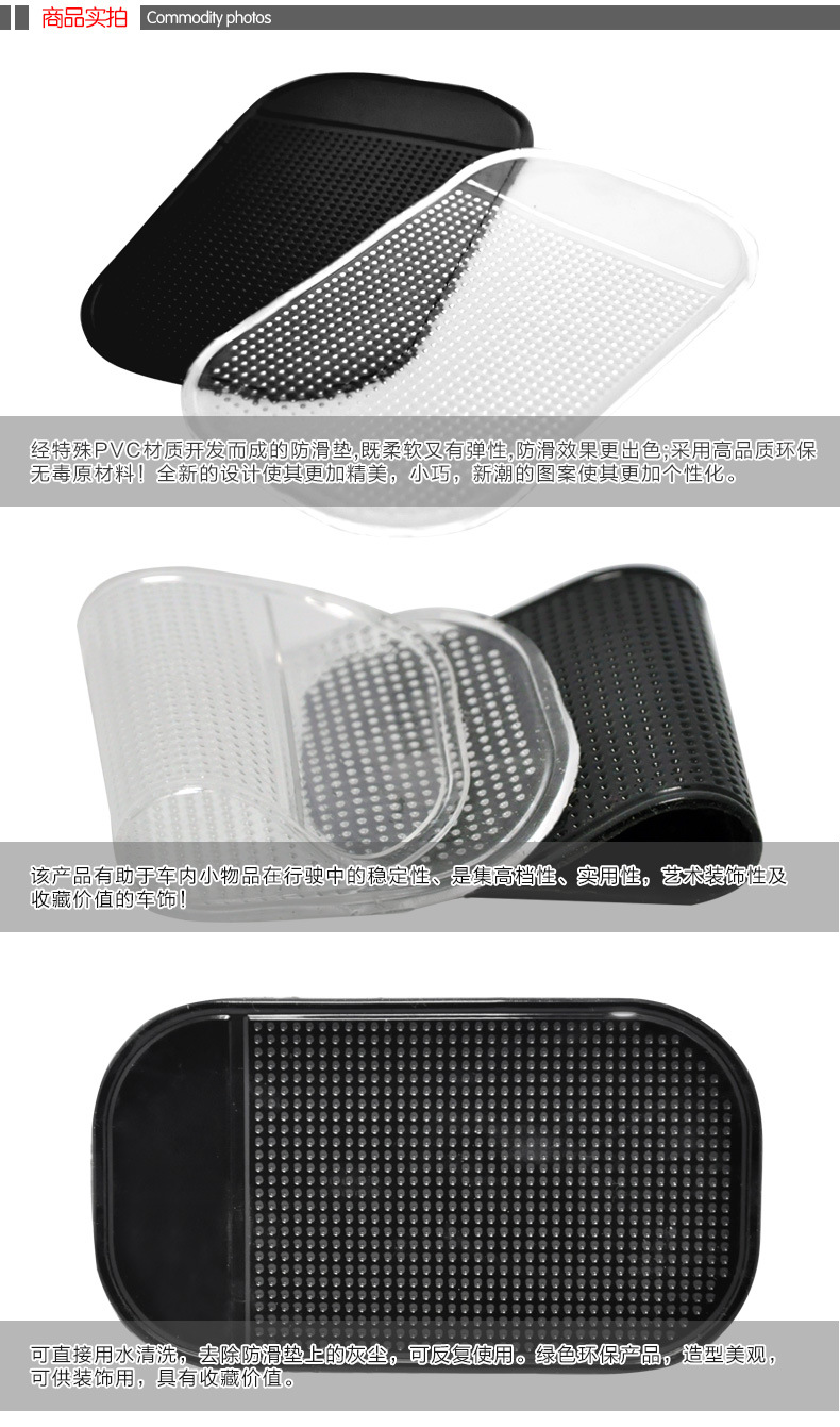 2.可贴于汽车任何平面位置上,可粘住并保护手机,CD盒,眼镜,烟盒,名片,纸张等移动物件,并且不会被贴面造成任何损害。
