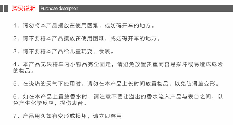 【注意事项】: 为了您与乘客的,切勿将胶垫和固定的物品放置在气囊上。 对表面不平或者磨沙表面的物品,粘力会下降。 为达到较好的固定效果,请将物品在胶垫上轻压1-2秒。 表面灰尘较多粘性下降时,请用清水冲洗。