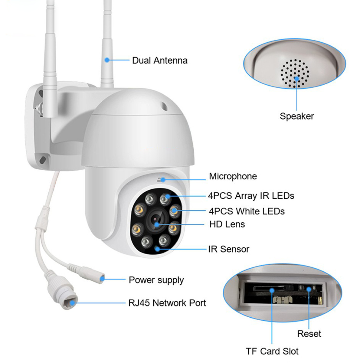 *4pcs IR LEDs+4pcs White LEDs, night vision distance 10m-30m;