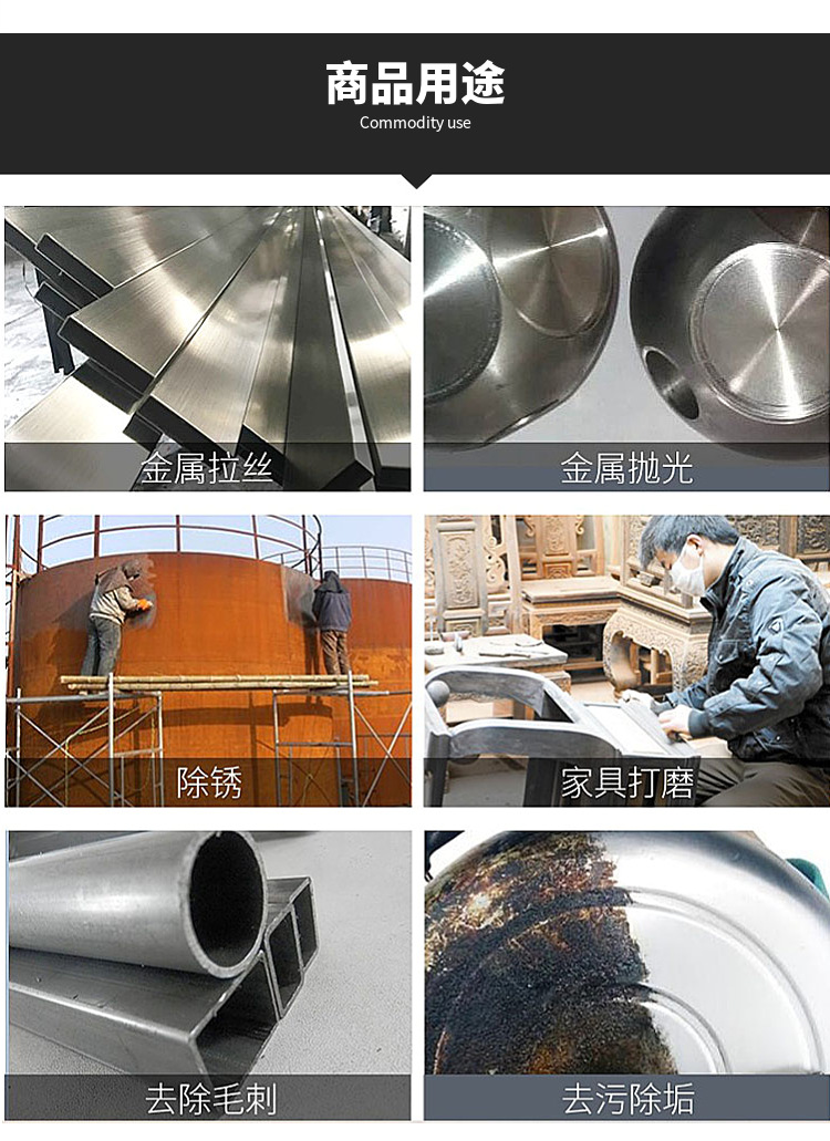 Используется в нержавеющей стали, алюминиевом сплаве, меди, всех видах металлических материалов, поверхностной ржавчине, гальванических продуктах с модифицированным зерном