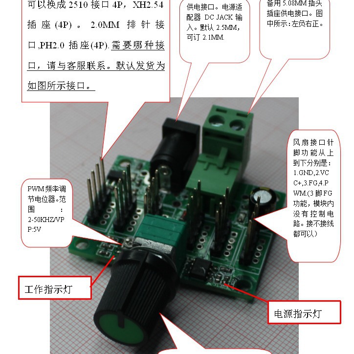 4.电源输入接口多种可选:大4P,SATA15P,DC插2.0/2.5MM,手机小USB口插座,XH2.54MM的2,3,4P插座,PH2.0MM的2,3,4P,2510规格2,3,4P插座,5.08MM的公母插头插座,可以订制TYPE-C电源协议接口,糕压交直流等供电接口驱动风扇。