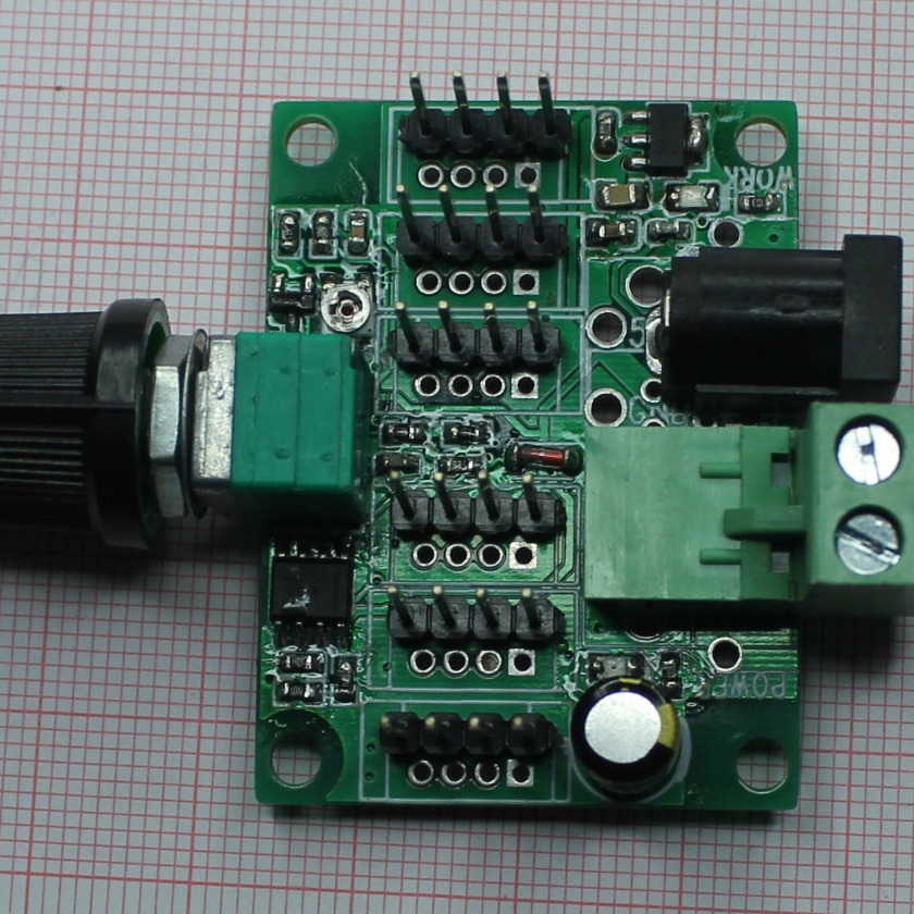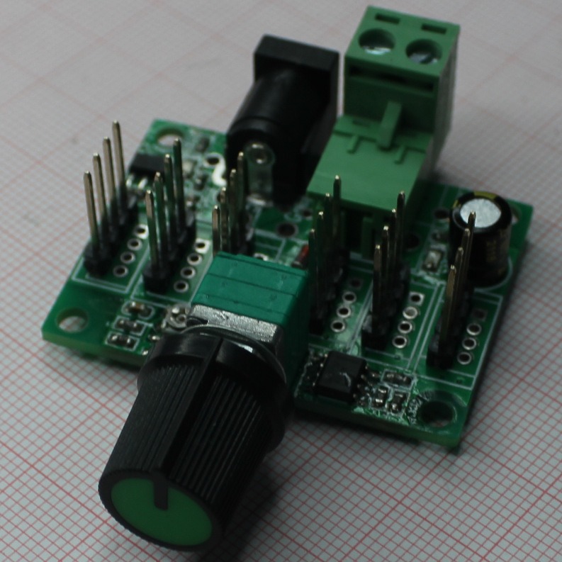4.PWM调速线规格:5V信号电平输出,标准方波脉冲信号。频率默认输出为25KHZ.板内小电位器可以调范围为2-50KHZ.但不建议用户自行用螺丝刀调这个电位器。信号输出电流极限为20MA,推荐长期用时,不要超过15MA.,脉冲输出信号为NPN上拉电阻方式