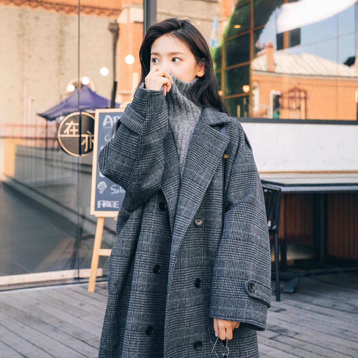 Шерстяное пальто в клетку с флисовой подкладкой, утепленное, женское, средней длины, в корейском стиле, свободного кроя, новая модель зимы 2025, студенческая шерстяная куртка.