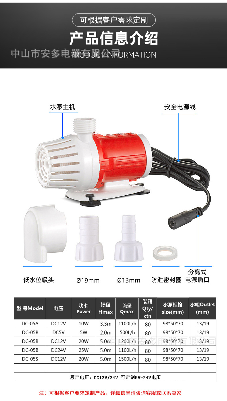 DC-05A DC12V 10W 3,3 м без адаптера питания (80/коробка); DC-05B DC12V 20W 5,0 M без адаптера питания (80 комплектов/коробка); DC-05S DC12V 20W шестиполюсный мотор, адаптер питания в комплект не входит (80 шт./коробка); DC-05B DC5V 5W USB штекер (80 шт./коробка)