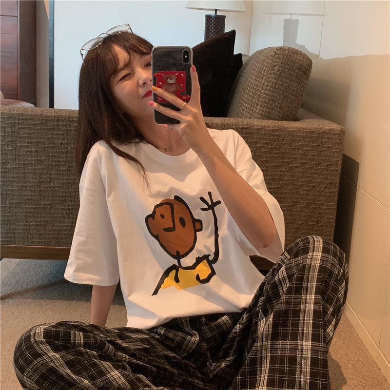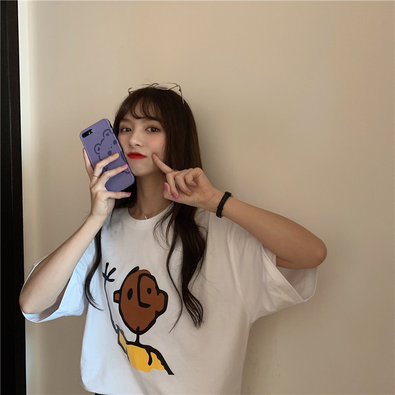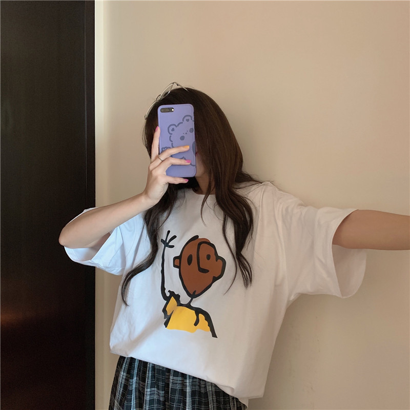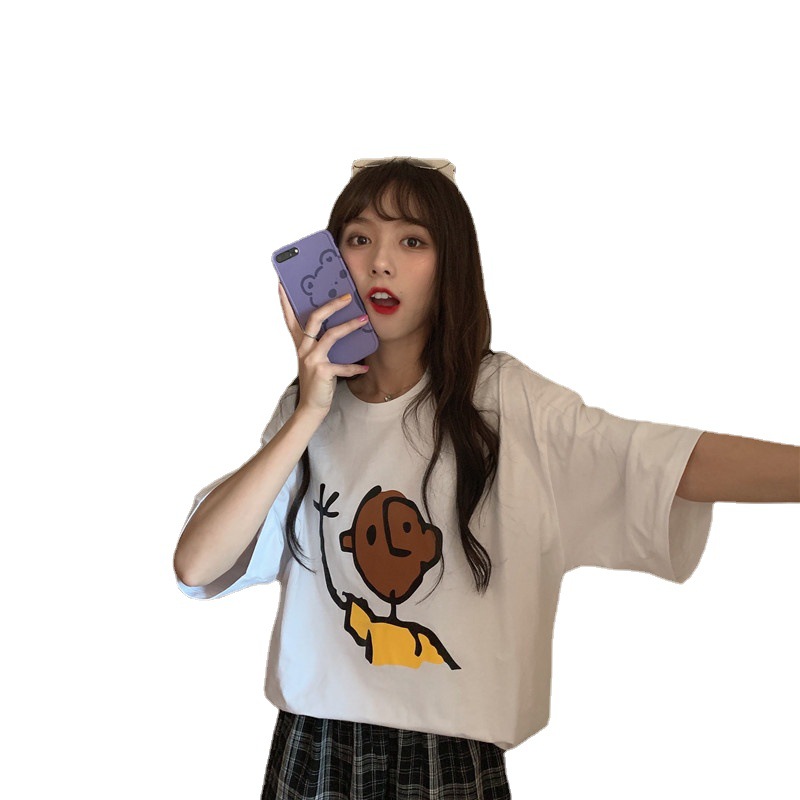 Футболка женская из чистого хлопка с принтом, короткий рукав, 2025 год, в корейском стиле, парный образ, повседневный свободный топ в стиле Гонконг, трендовый бренд для студентов