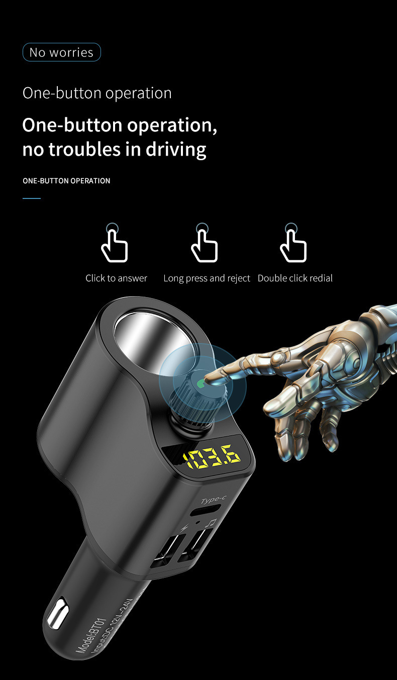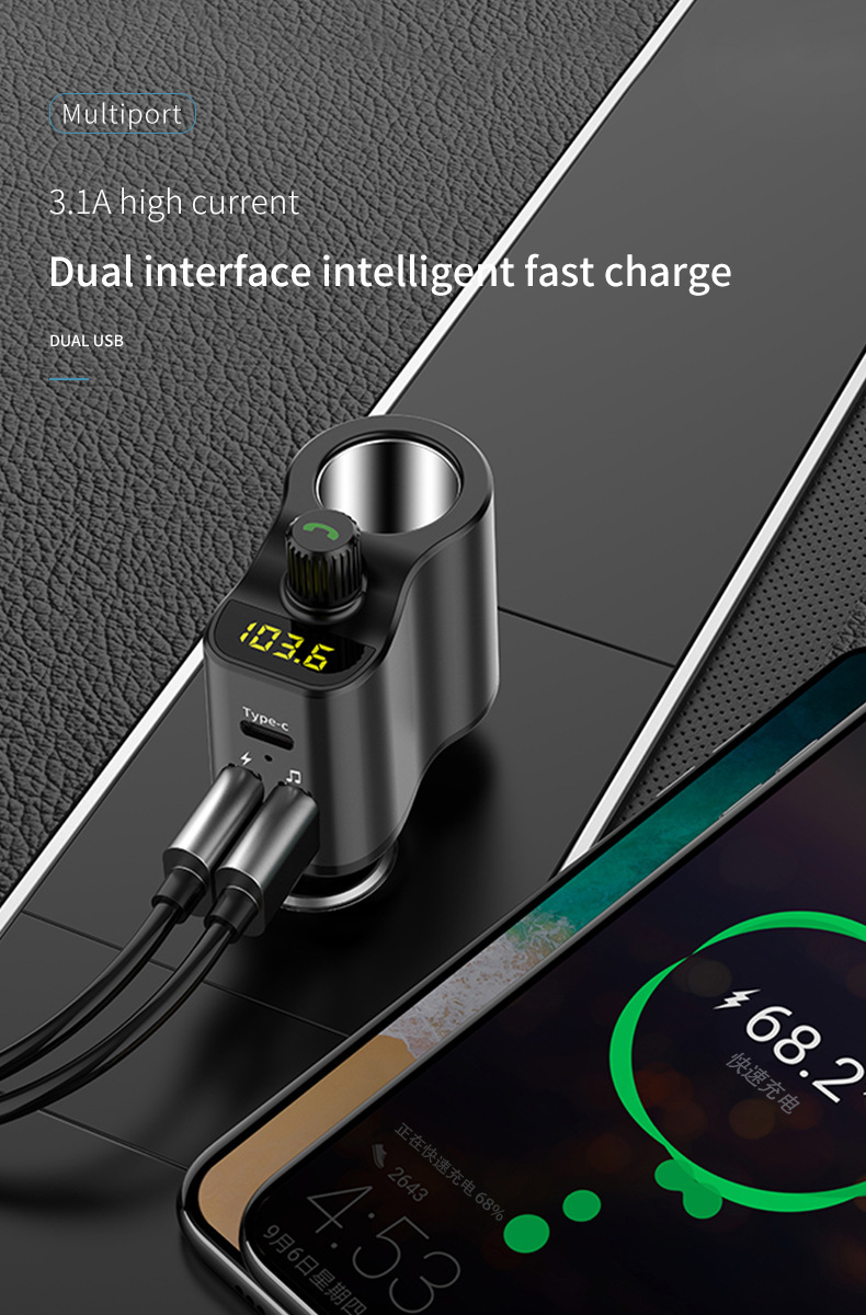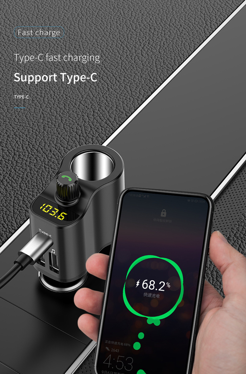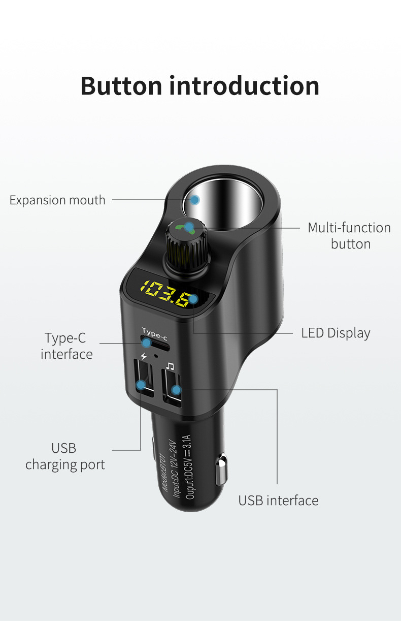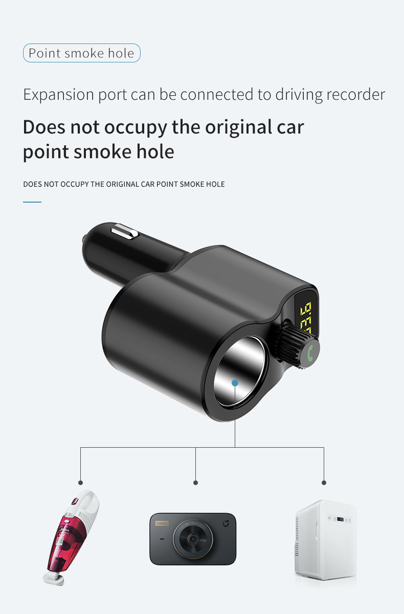 6.全频点发射,87.5-108.0MHZ 7.LED数码屏,显示FM频率 工作状态(bt、Call等),汽车电瓶电压检测 8.支持手机导航扩音 手机充电续航 边导航 边听歌 边充电 互不干扰 9.汽车电瓶电压语音播报及显示 10.支持点烟筒扩展,方便车内各种电器,输出功率可达到80W.