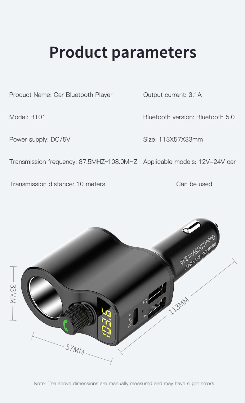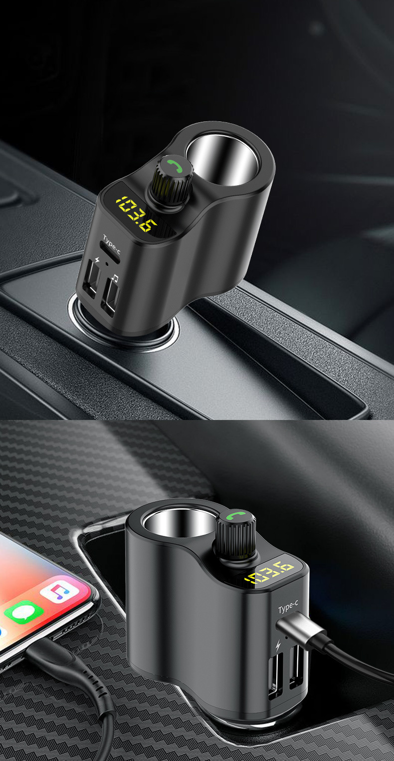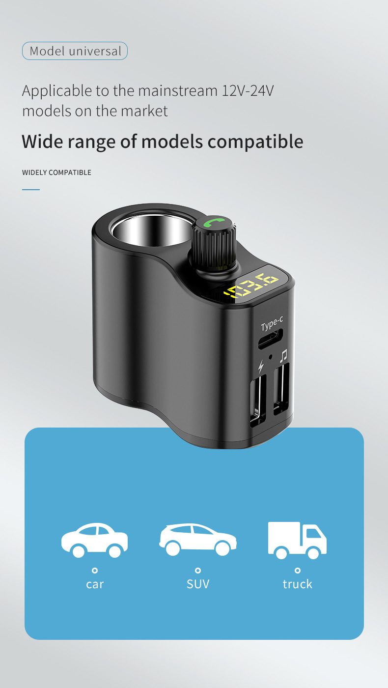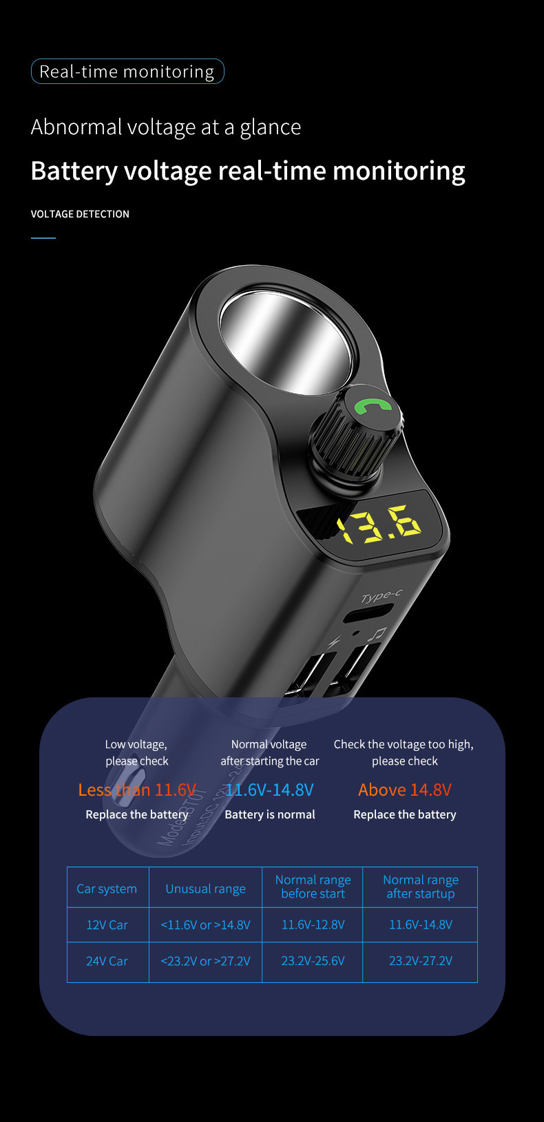6.全频点发射,87.5-108.0MHZ 7.LED数码屏,显示FM频率 工作状态(bt、Call等),汽车电瓶电压检测 8.支持手机导航扩音 手机充电续航 边导航 边听歌 边充电 互不干扰 9.汽车电瓶电压语音播报及显示 10.支持点烟筒扩展,方便车内各种电器,输出功率可达到80W.