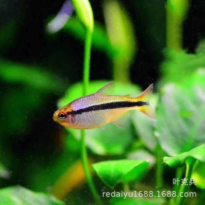 赤目、黄嘴,各鳍发红。以上鳍为界,前段能通体发紫,后段则通体发黄。魔鬼特征的黑间从眼部直通尾根,前细后粗,黄点尾延伸出红色。色彩渐变、对比得非常醒目,夺人眼球。