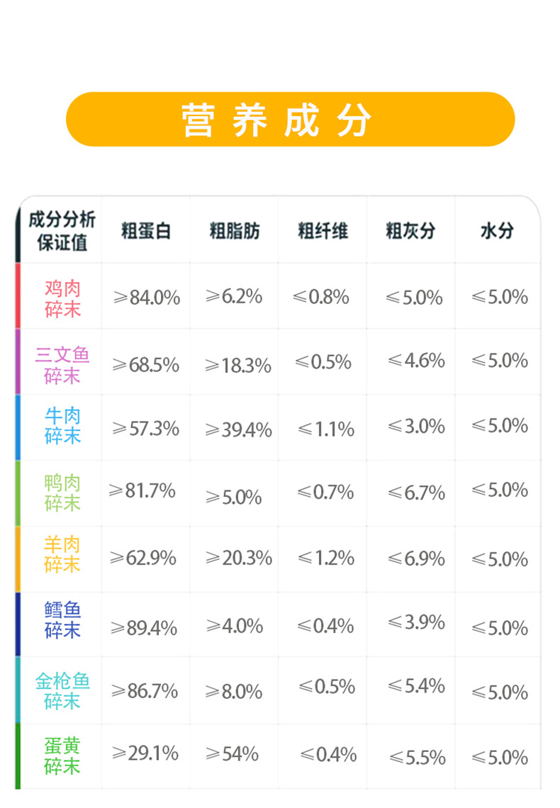 Сублимированный яичный желток мякоть 110 г; Сублимированный Куриный фарш 60 г; Сублимированный-сушеный говяжий фарш 70 г; Мясной фарш из лосося сублимированный 50 г; Лиофилизированная-Высушенная треска 50 г; Сублимированное мясо утки рубленое 65 г; Сублимированный рубленый фарш из баранины 75 г