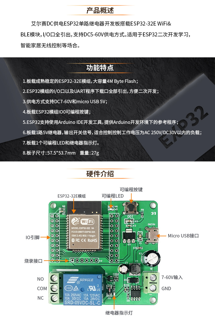 DC5-60V питание ESP32 с одним релейным модулем Плата разработки ESP32 ESP32-WROOM