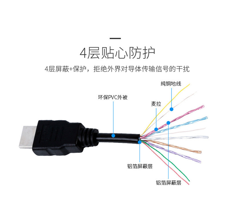 产品优势:全镀金接口,多层屏蔽结构,进口环保PVC护套绝缘、抗磨损、柔韧性强。