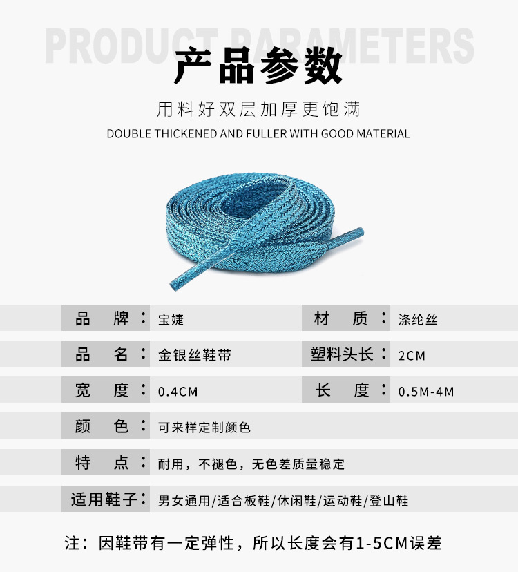2.产品代发价格已含运费,如果已揽收发货,需要扣除处理费+快递费5元 3.现货长度120/140/160cm/180cm。其他长度可联系客服定制 。 4.因鞋带是有轻微弹性,所以实际长度上下会有1cm-5cm的误差,介意者勿拍! |