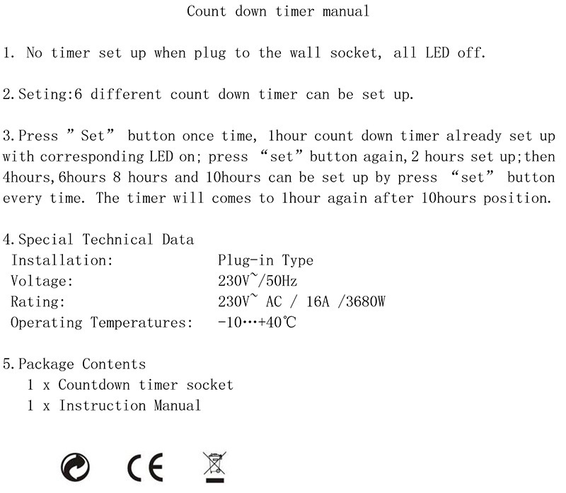 此产品为自动倒数计时同时测量所用电器的功耗、电压、电流、计时等多功能插座,产品可以满足德、英、澳、美、法、意大利、以色列、比利时、丹麦、南非、巴西等不同国家标准定制