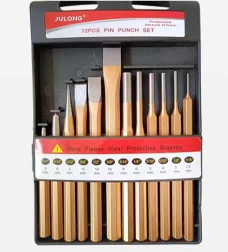 Набор из трех плоских долот (в тканевом мешке); Набор для штамповки из шести предметов (упакован в тканевый мешок); Набор для штамповки и долбления из 12 предметов (пластиковая коробка); Набор из 3 восьмиугольных плоских долот (пластиковая коробка); Набор для штамповки и долбления из 6 предметов (пластиковая коробка); Набор цилиндрических пробойников из 6 предметов (пластиковая коробка); Плоское долото 12*20*250; Плоское долото 12*20*300; Плоское долото 8*14*150; Плоское долото 11*17*175; Плоское долото 11*17*200; Плоское долото 11*17*250; Плоское долото 11*17*300; Плоское долото 12*20*200; Плоское долото 13*23*250; Плоское долото 13*23*300; Точило восьмиугольное 16*300; Точечное долото 17*11*250; Тесак с резиновой ручкой 16*300; Кирка круглая плоская с красной пластиковой ручкой 23*13*250; Красная резиновая ручка, круглое плоское долото 23*13*300; Секатор плоский шестигранный с желтой резиновой ручкой 16*300; Штифт 3 мм.; Штифт 4 мм; Штифт 5 мм; Штифт 6 мм.; Штифт 7 мм; Штифт 8 мм; Центровочный пуансон 4 мм; Центровочный пуансон 5 мм; Центровочный пуансон 6 мм.; Конусный пробойник 5 мм.; Плоское долото восьмиугольное 13*175мм.; Плоское долото восьмиугольное 10*165мм.; Плоское долото восьмиугольное 16*200мм.