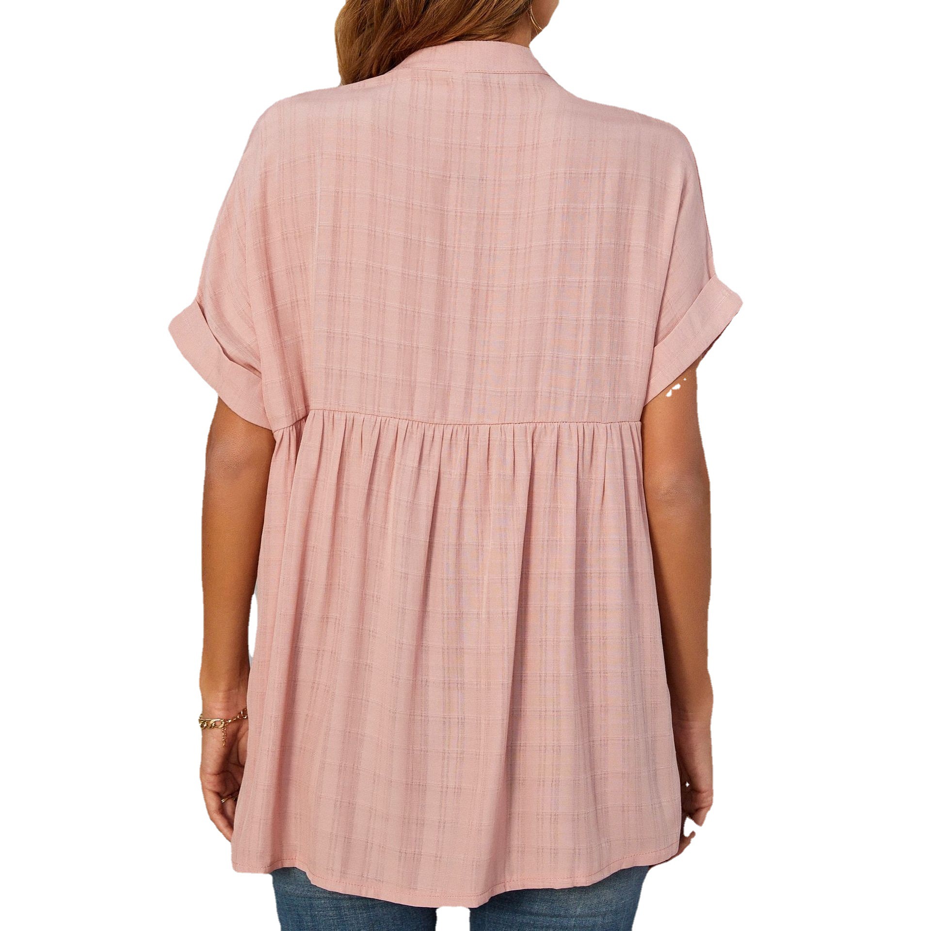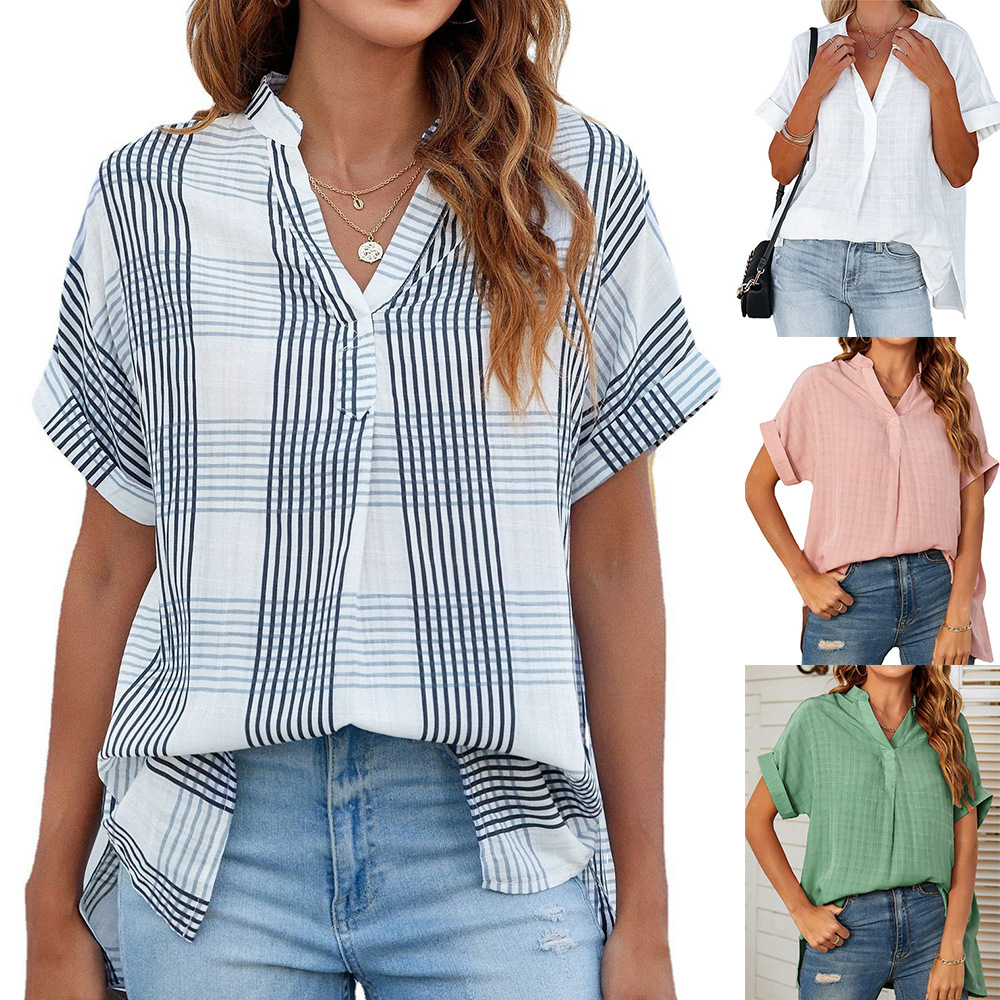 Трансграничная Европа и США 2023 летняя новая женская тонкая свободная клетчатая рубашка Amazon с V-образным вырезом и короткими рукавами