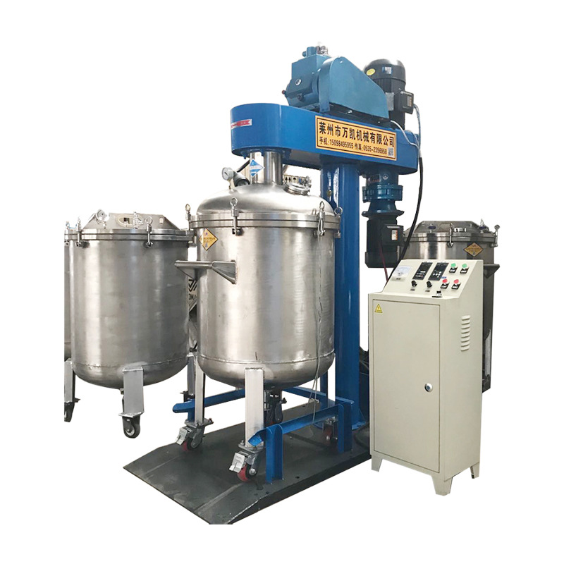 三、 技术参 1. 设备搅拌功率:2.5kw 2. 设备设计容积:120L,工作容积:100L 3. 设备带有真空脱泡功能,真空度:-0.1 4. 设备双行星搅拌桨叶,搅拌效率高,效果好 5. 设备电源:3相~380V 6. 1200*1500*2000(㎜) 7. 整机重量:200㎏ 8. 工作气压:>0.4Mpa 9. 设备材质:接触物料(不锈钢304) 10.设备带加热和高速分散功能。