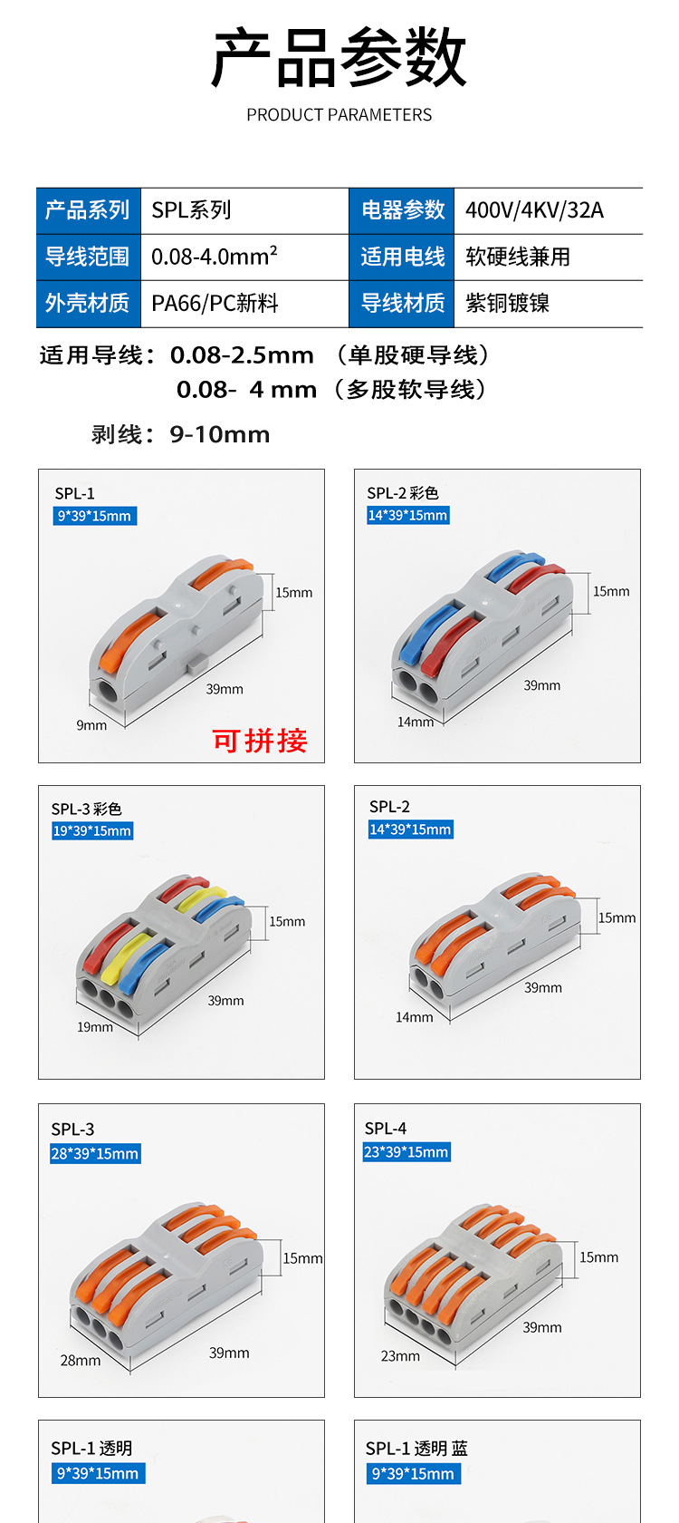 SPL-3TR прозрачный; SPL-2C цвет; SPL-2; SPL-3; SPL-2TR прозрачный; SPL-1TB (многократное Сращивание синего цвета); SPL-1TR (можно соединить оранжевым цветом); SPL-1 (допускается несколько сращивания); SPL-4; SPL-3C цвет