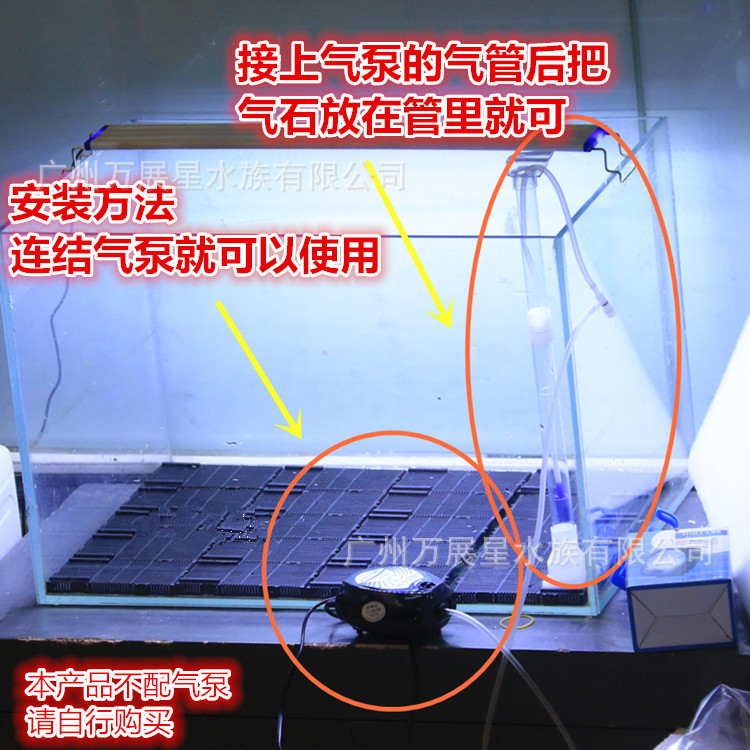 2,用气泵带动,本品另外带有一可以伸缩的管子,可以适用于各种高度的鱼缸使用,将气泵出气口接到底滤上的沙头上就可以了,利用空气上浮的原理带动水的流动,还可以增加鱼缸的溶氧量.