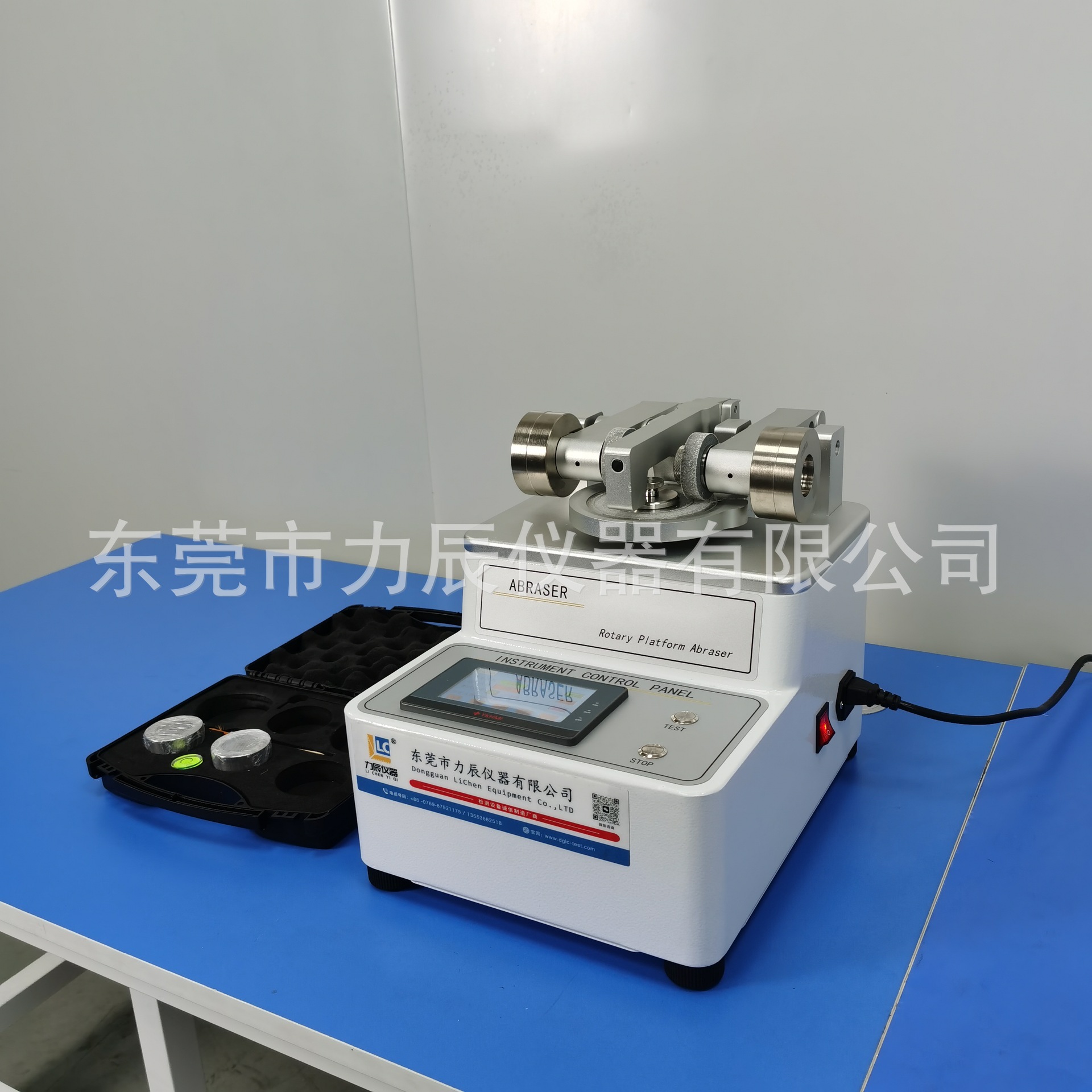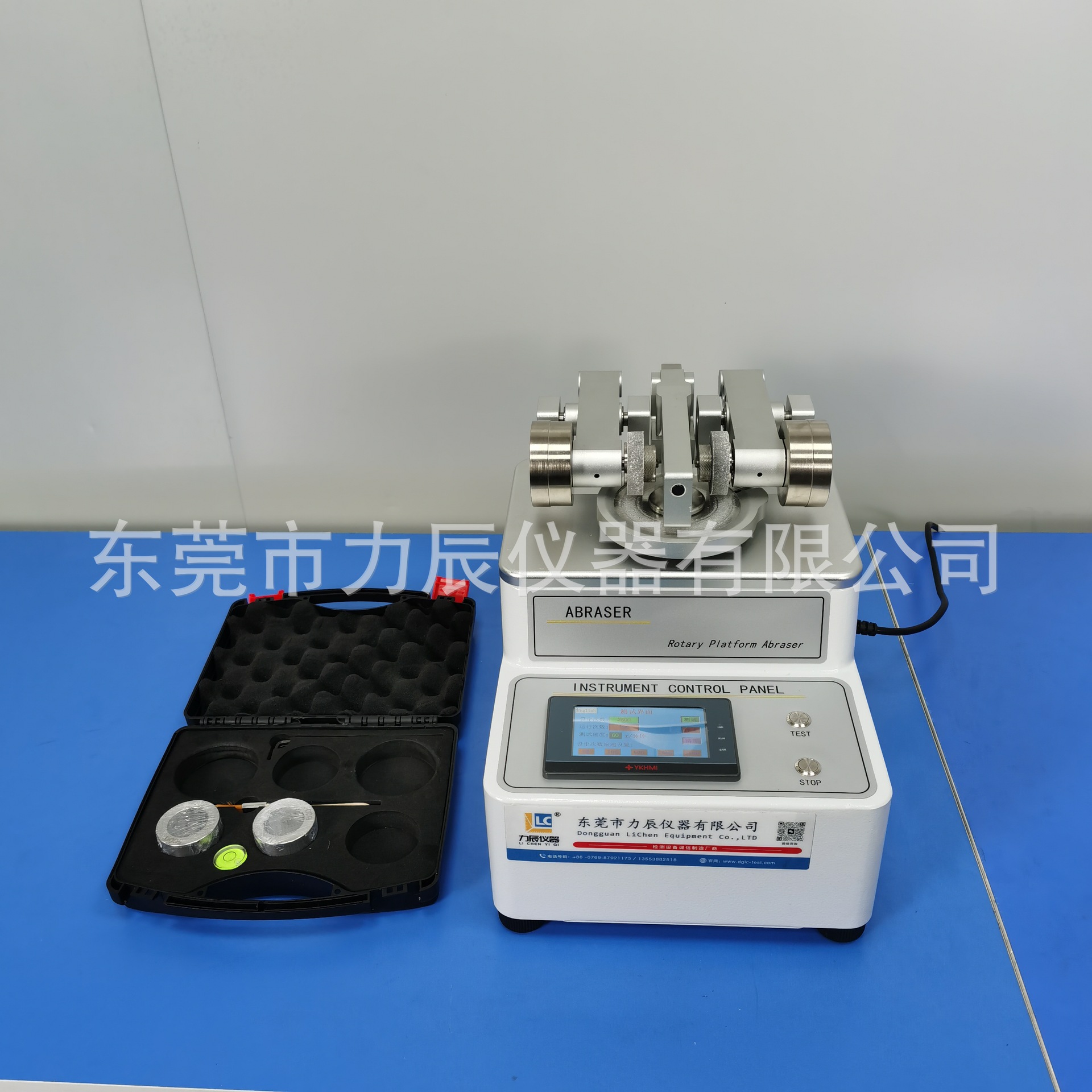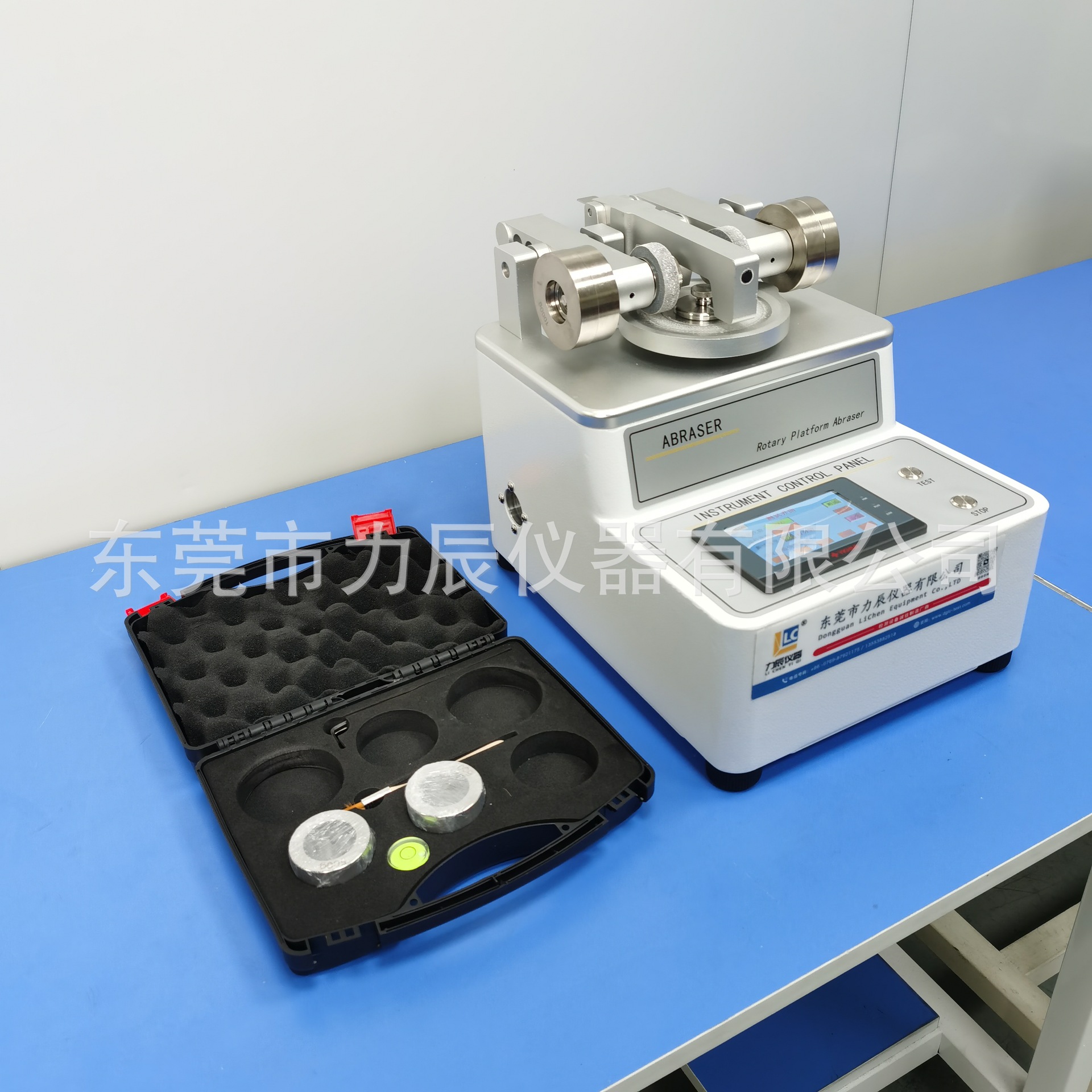 本仪器上部为试样夹具和一对磨耗轮,磨耗轮上附加有配重砝码,通过电机使试样夹逆时针旋转,带动磨耗轮,使得磨耗轮与试样发生摩擦,经过一定次数的摩擦,停止仪器运转,取下试样,观察其磨损的程度对其耐磨性进行评价,为材料选取提供参考数据。