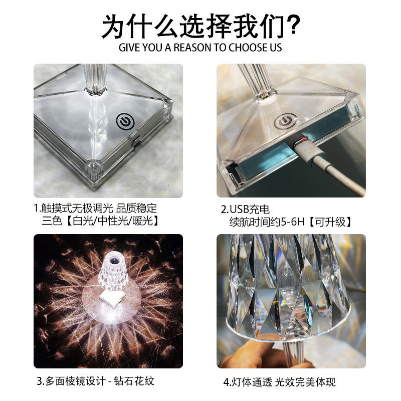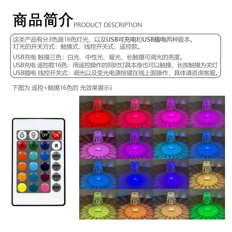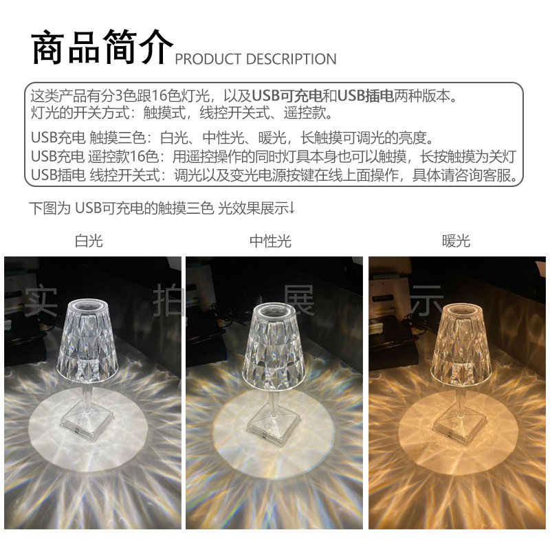 Алмазная лампа-Touch Трехцветное освещение-USB перезаряжаемая модель; Алмазная лампа-RGB16 Цветной сенсорный пульт дистанционного управления с затемнением-модель с зарядкой через USB; Алмазная лампа-USB-разъем, кнопка управления линией, три цвета