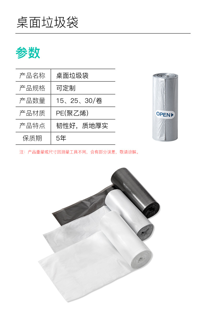 温馨提示:这款是桌面垃圾袋,相对来说尺寸是小的哦,下单的时候确认下是否合适。由于是桌面垃圾袋适合桌面垃圾桶使用,一般是不会装很多东西下去的,看表面是不厚,但也是足够用的呢。有其他问题再联系在线客服哈!