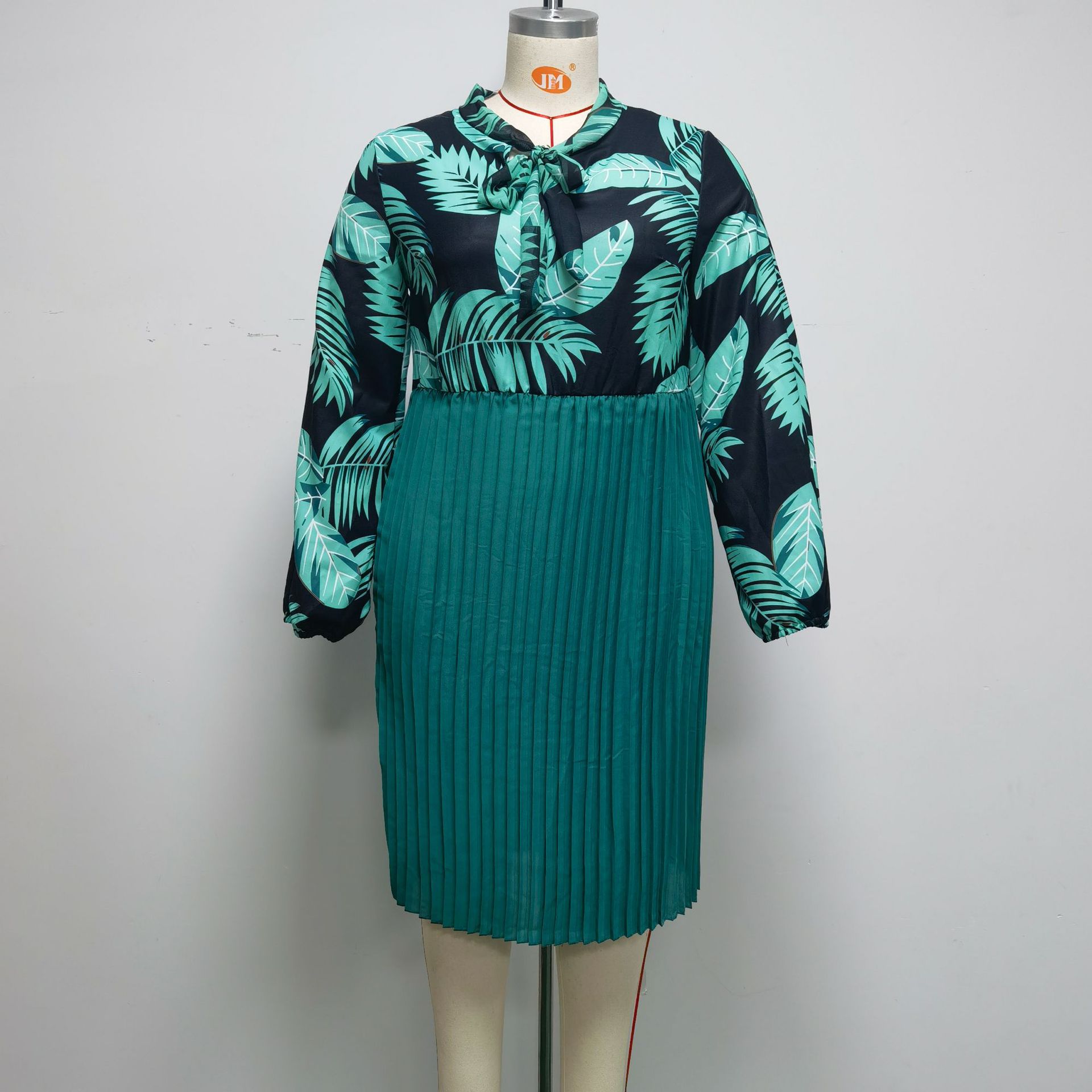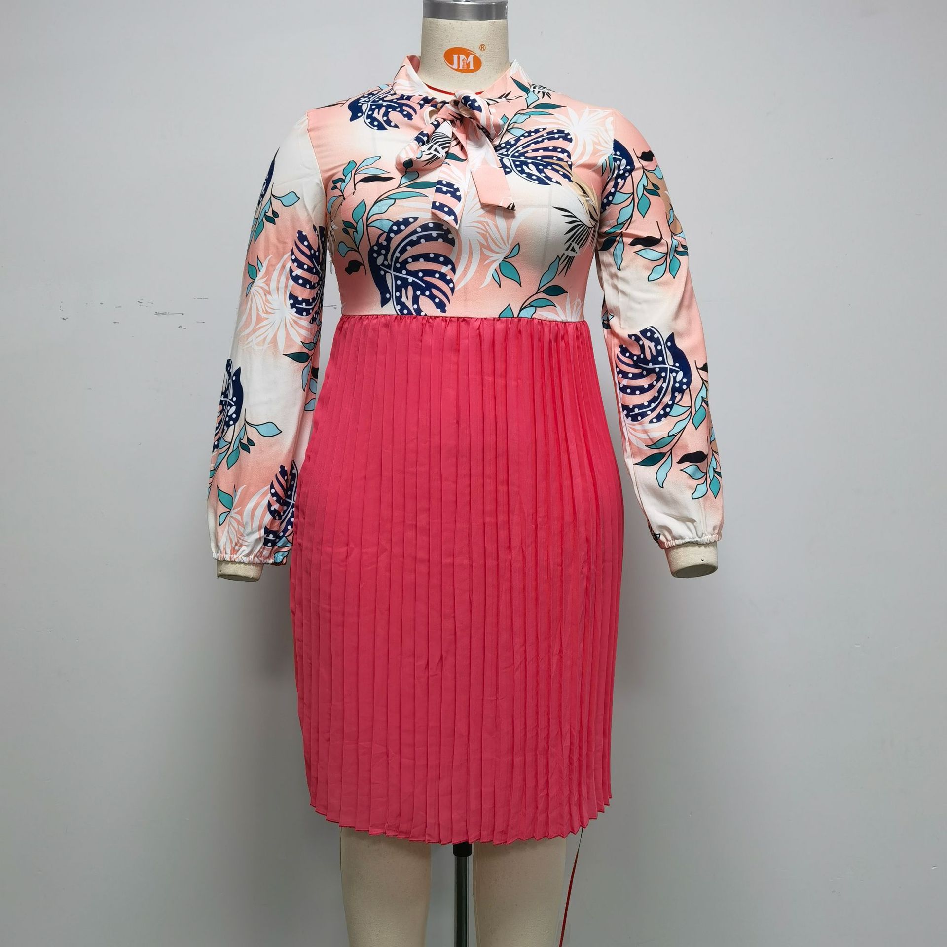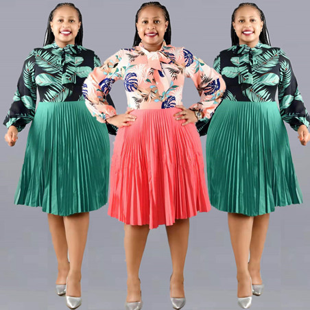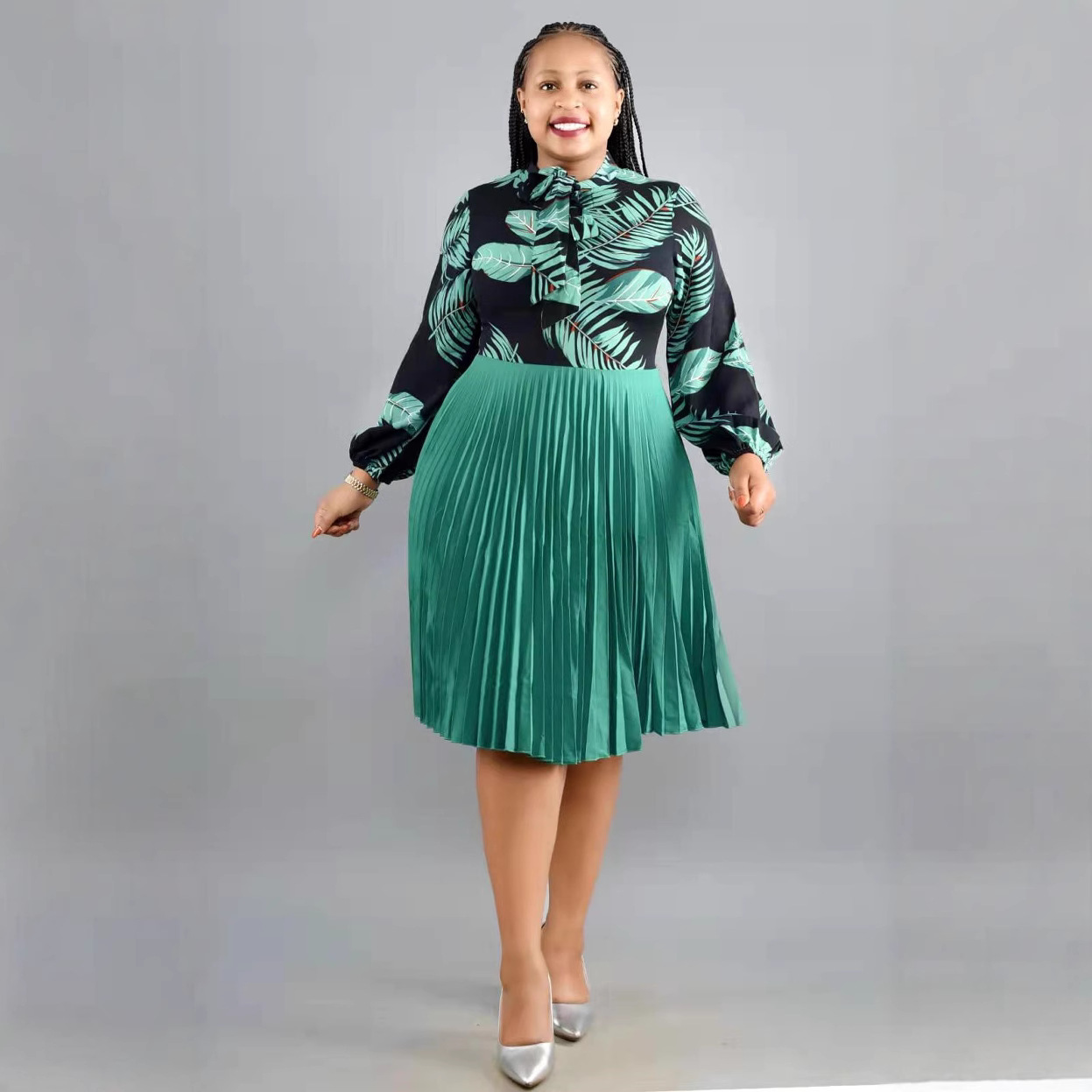 2022 Африканское женское Новое плиссированное платье больших размеров с круглым вырезом и бантом и длинными рукавами с принтом JX090